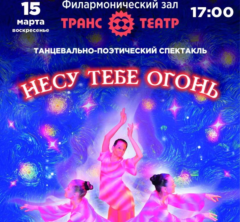 17:00 – в Филармоническом зале танцевально-поэтический спектакль Транс-Театра «Несу тебе огонь», посвященный женщине (12+)