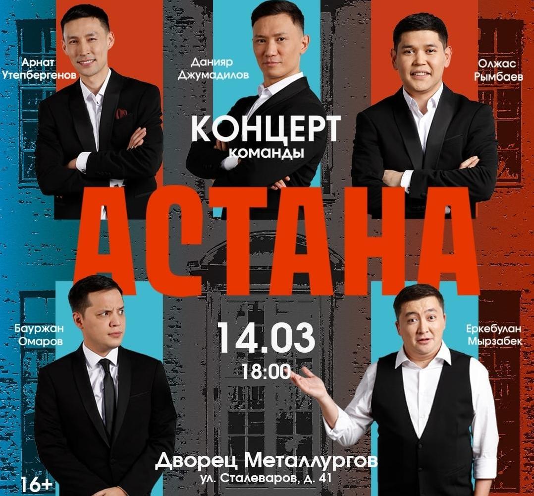 18:00 – во Дворце металлургов премьера большого тура команды «Астана» (16+). Участники легендарных проектов («Звезды» на НТВ, «Игра» и «Концерты» на ТНТ): Данияр Джумадилов, Арнат Утепбергенов, Еркебулан Мырзабек, Бауржан Омаров, Олжас Рымбаев.