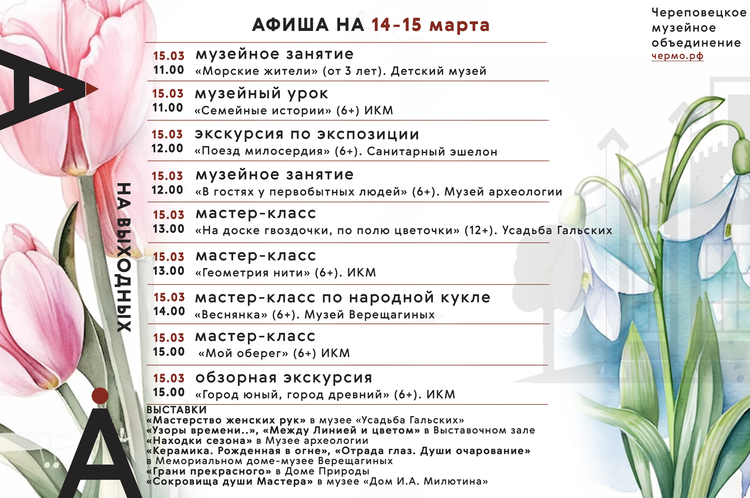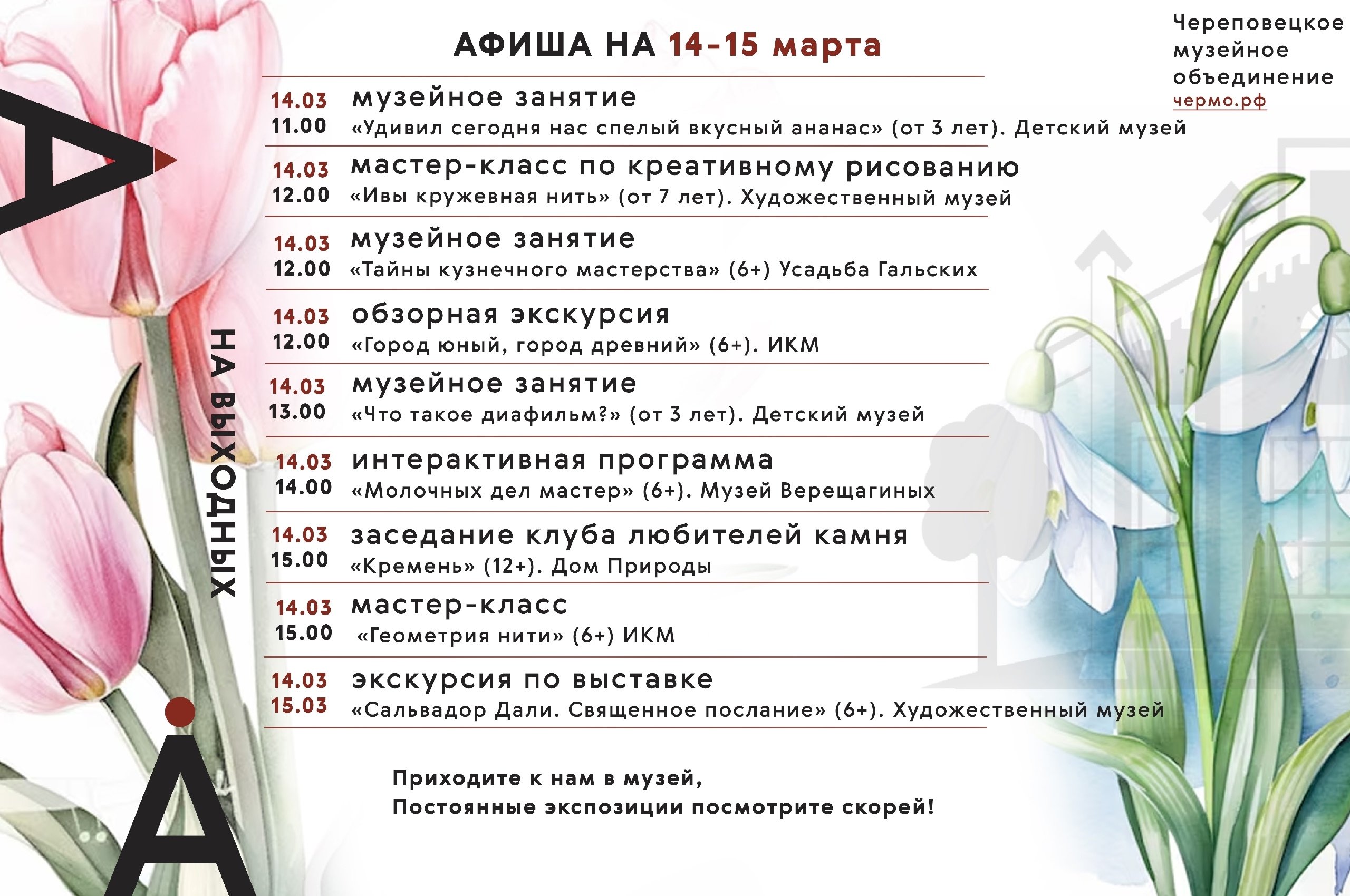 Весенние выходные становятся интереснее с афишей занятий, мастер-классов и экскурсий в музеях.