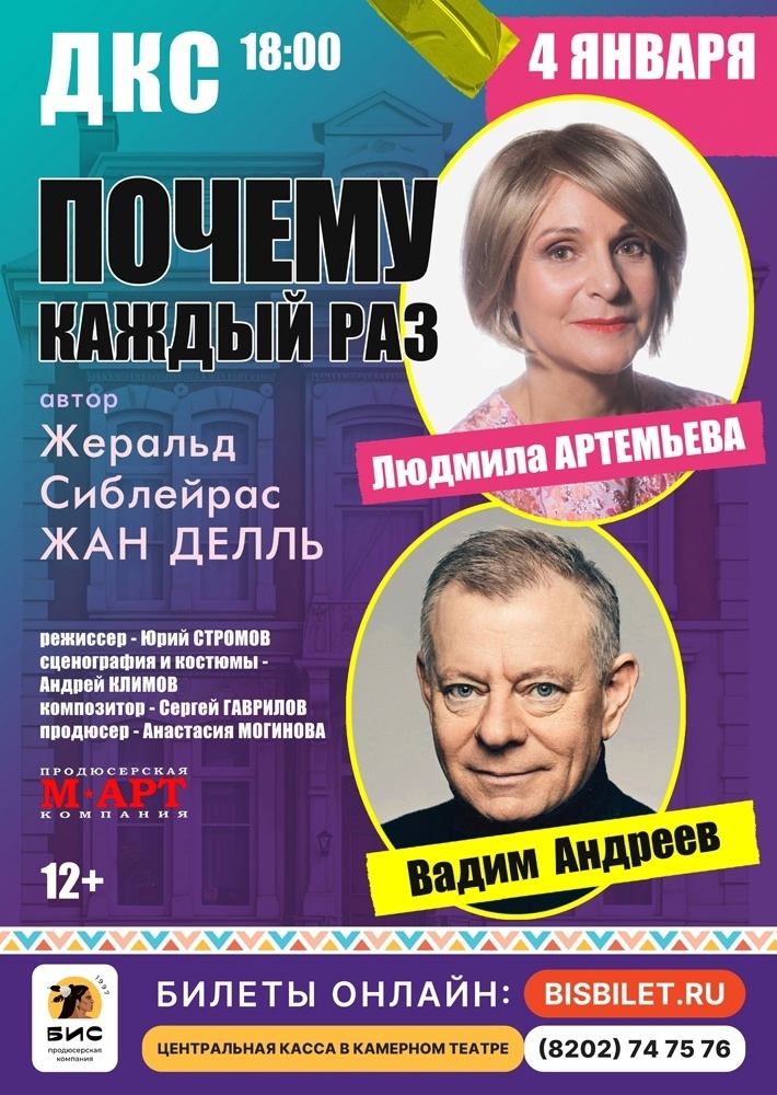 18:00 в ДК «Строитель» — лирическая комедия «Почему каждый раз» (12+). В ролях — звезды российского театра и кино Людмила Артемьева и Вадим Андреев.