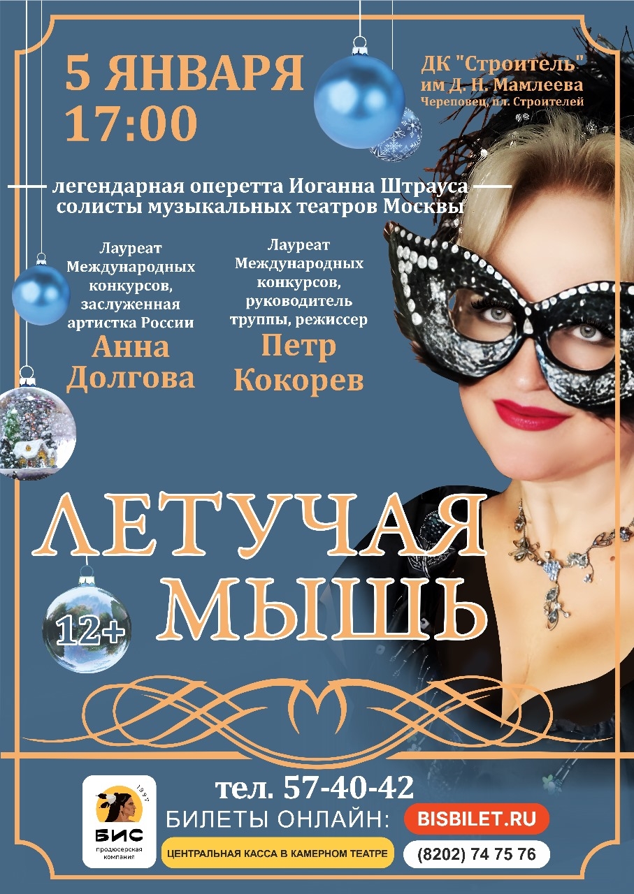 17:00 – в ДК «Строитель» легендарная оперетта Иоганна Штрауса «Летучая мышь» (12+). Выступят солисты музыкальных театров Москвы: Анна Долгова, Пётр Кокорев.