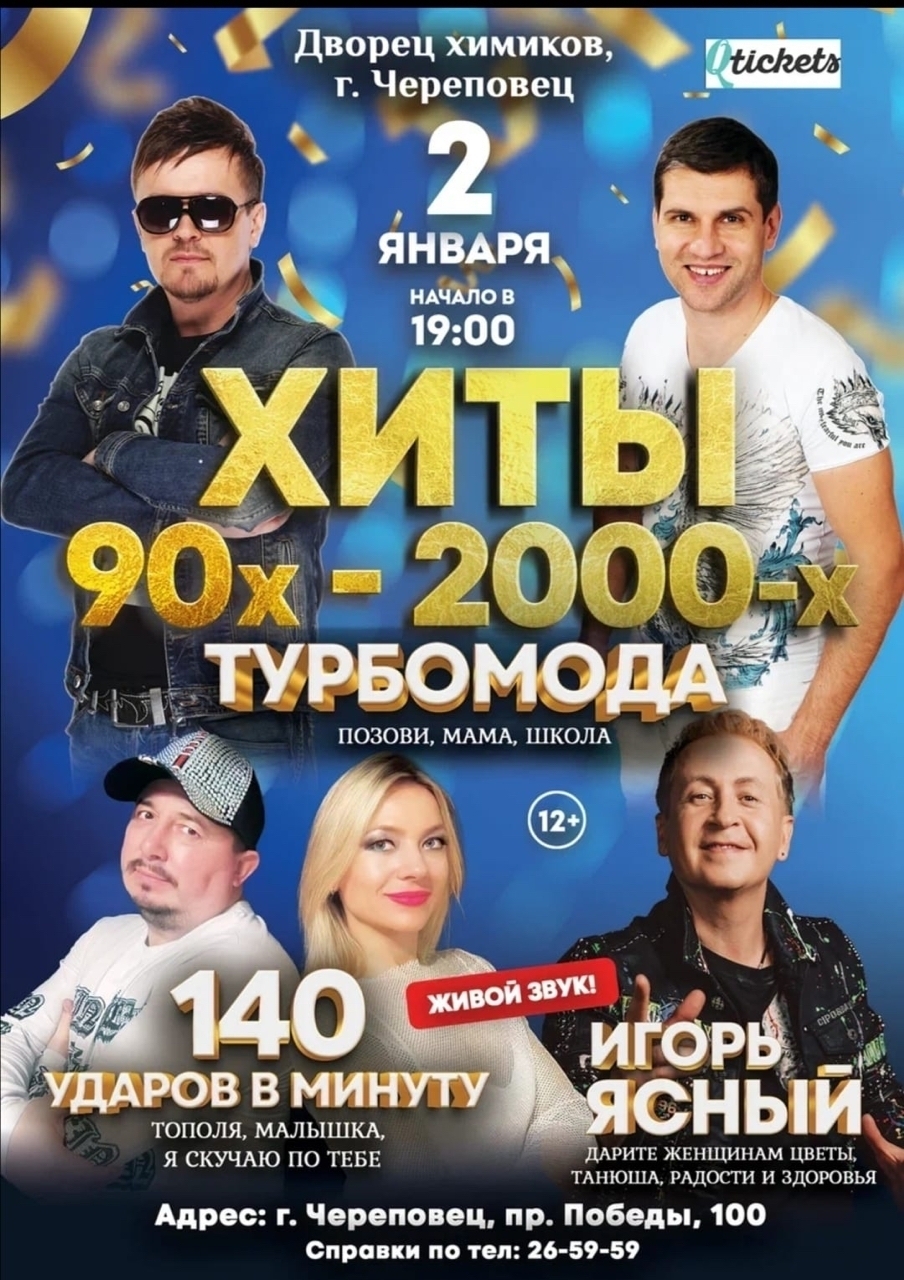 19:00 — во Дворце химиков пройдет концерт «Хиты 1990-х — 2000-х» (12+) с участием популярных исполнителей этих лет: «140 ударов в минуту», «Турбомода», Игорь Ясный и других.