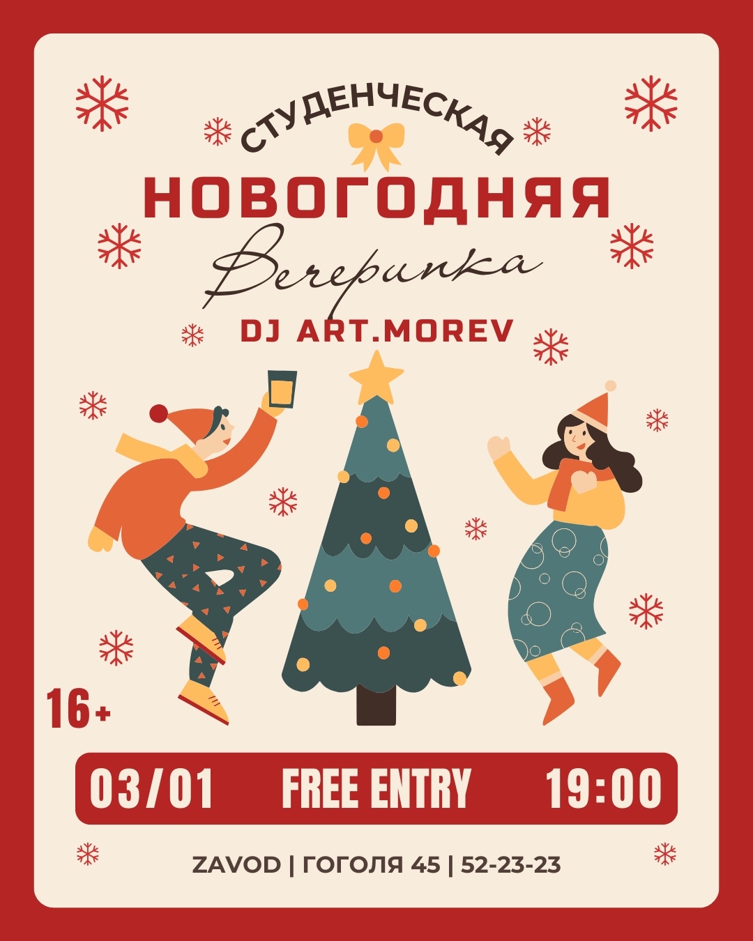 19:00 — в арт-кластере «Zavod» (ул. Гоголя, 45) студенческая новогодняя вечеринка (18+).