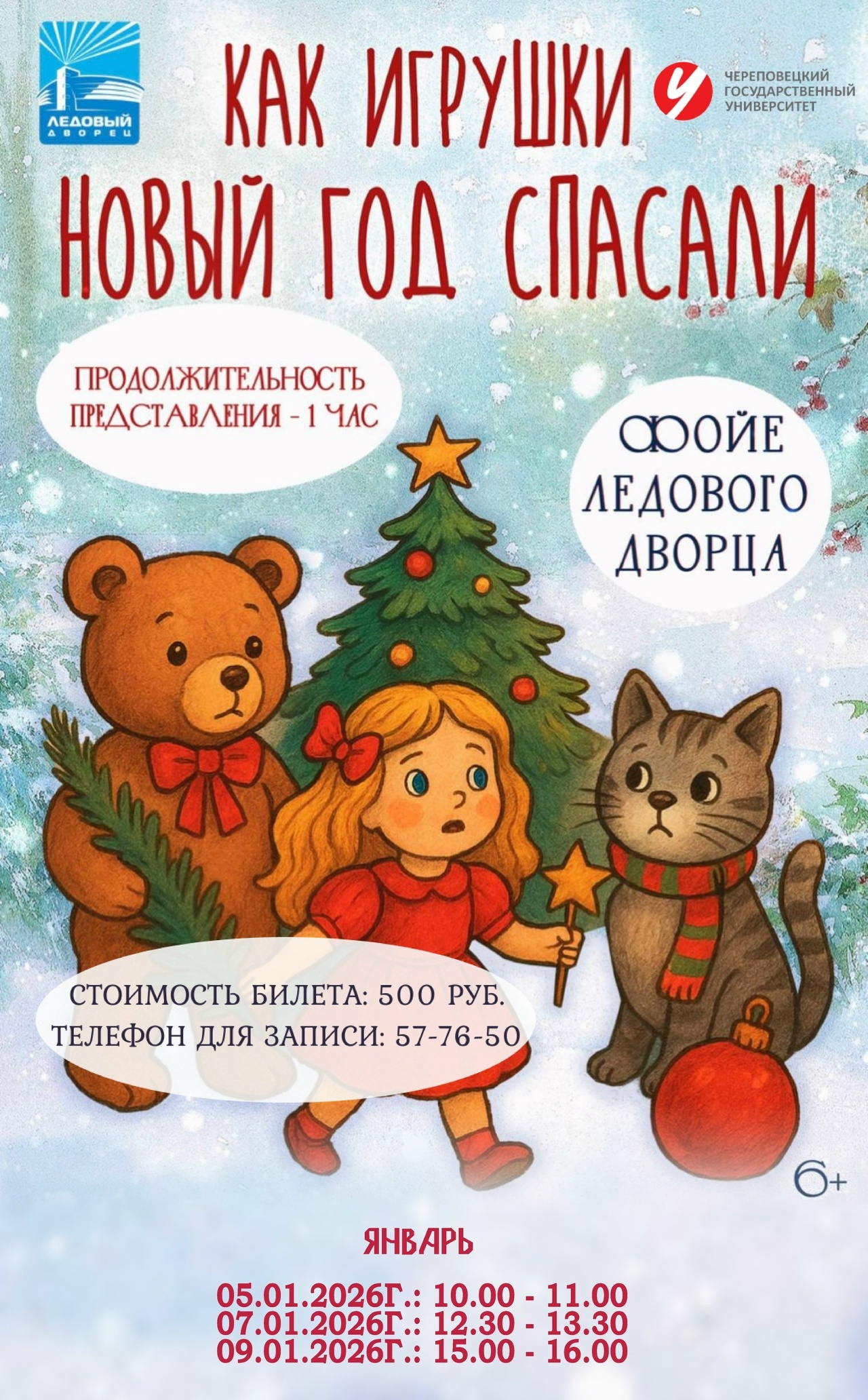 Ледовый дворец приглашает на новогоднюю сказку «Как игрушки Новый год спасали!» (0+). Сеансы: 5 января: 10:00–11:00; 7 января: 12:30–13:30; 9 января: 15:00–16:00.