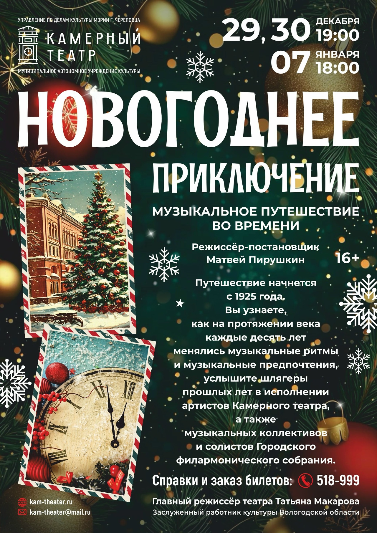 18:00 – музыкальное путешествие во времени «Новогоднее приключение» (16+) в Камерном театре. Провожая 2025-й год, зрителей перенесут на столетие назад. Вы увидите, как менялись музыкальные предпочтения в течение века, услышите шлягеры прошлых лет в исполнении артистов Камерного театра и музыкальных коллективов и солистов Городского филармонического собрания.