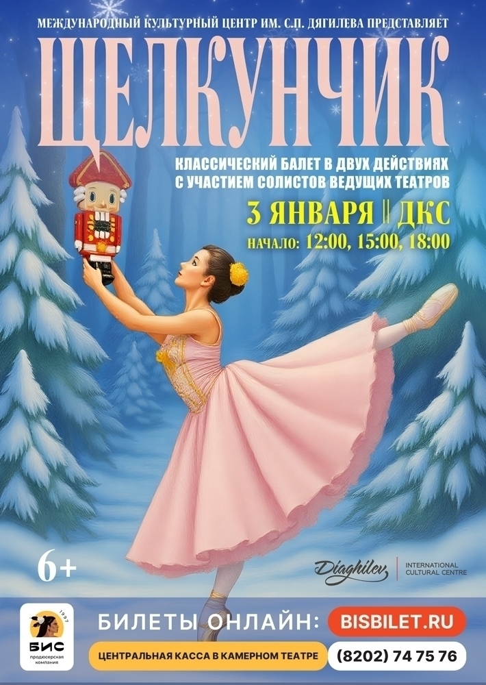 Балет «Щелкунчик» (6+) на сцене ДК «Строитель». Сеансы в 12:00, 15:00 и 18:00. Балет представит Международный культурный центр С. Дягилева (Санкт-Петербург).