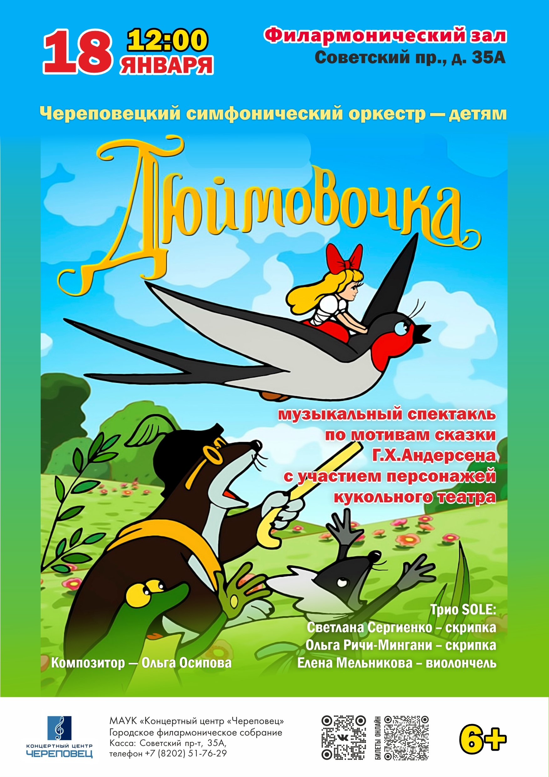12:00 — в Филармоническом зале (Советский пр., 35а) пройдёт музыкальный спектакль «Дюймовочка» (0+) с участием персонажей кукольного театра в исполнении струнного трио «Sole».