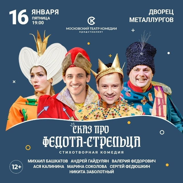 19:00 — во Дворце металлургов спектакль от Московского театра комедии - «Сказ про Федота — стрельца» (12+). В постановке заняты Михаил Башкатов, Андрей Гайдулян, Валерия Федорович, Ася Калинина, Марина Соколова, Сергей Федюшкин, Никита Заболотный.