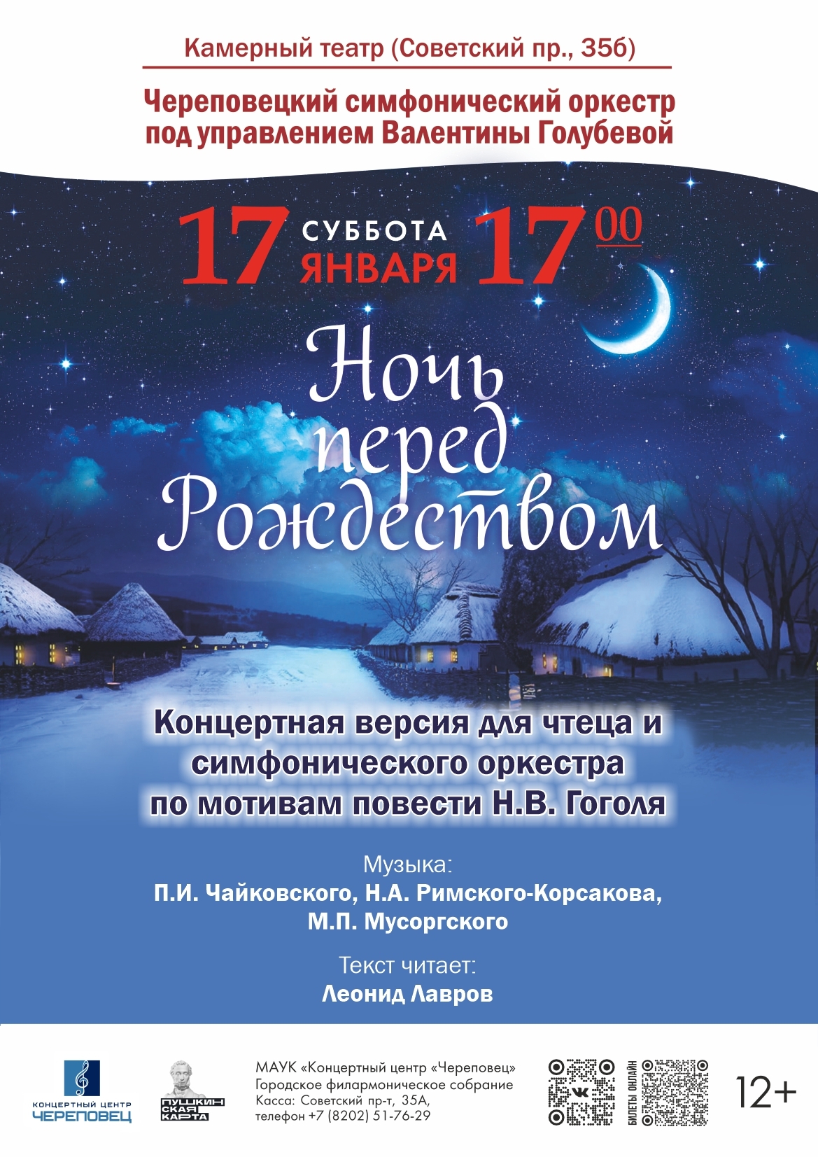 17:00 — в Камерном театре Череповецкий симфонический оркестр под управлением Валентины Голубевой представит концертную версию для чтеца и оркестра «Ночь перед Рождеством» (12+). Текст читает Леонид Лавров.