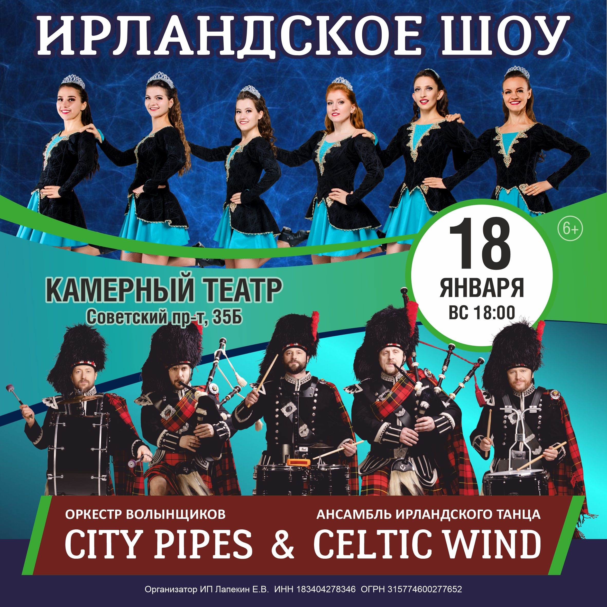 18:00 — в Камерном театре гастролирует «Ирландское шоу» (6+) от оркестра волынщиков «City Pipes» и ансамбля ирландского танца. В программе — музыкальные произведения Ирландии и Шотландии в исполнении волынок, барабанов, электрооргана и флейт. Ансамбль ирландского танца Celtic Wind представят участники крупных профессиональных проектов, таких как Rhythm in the Night (США) и Take the Floor (Ирландия), призёры международных фестивалей народного танца и театрального искусства.