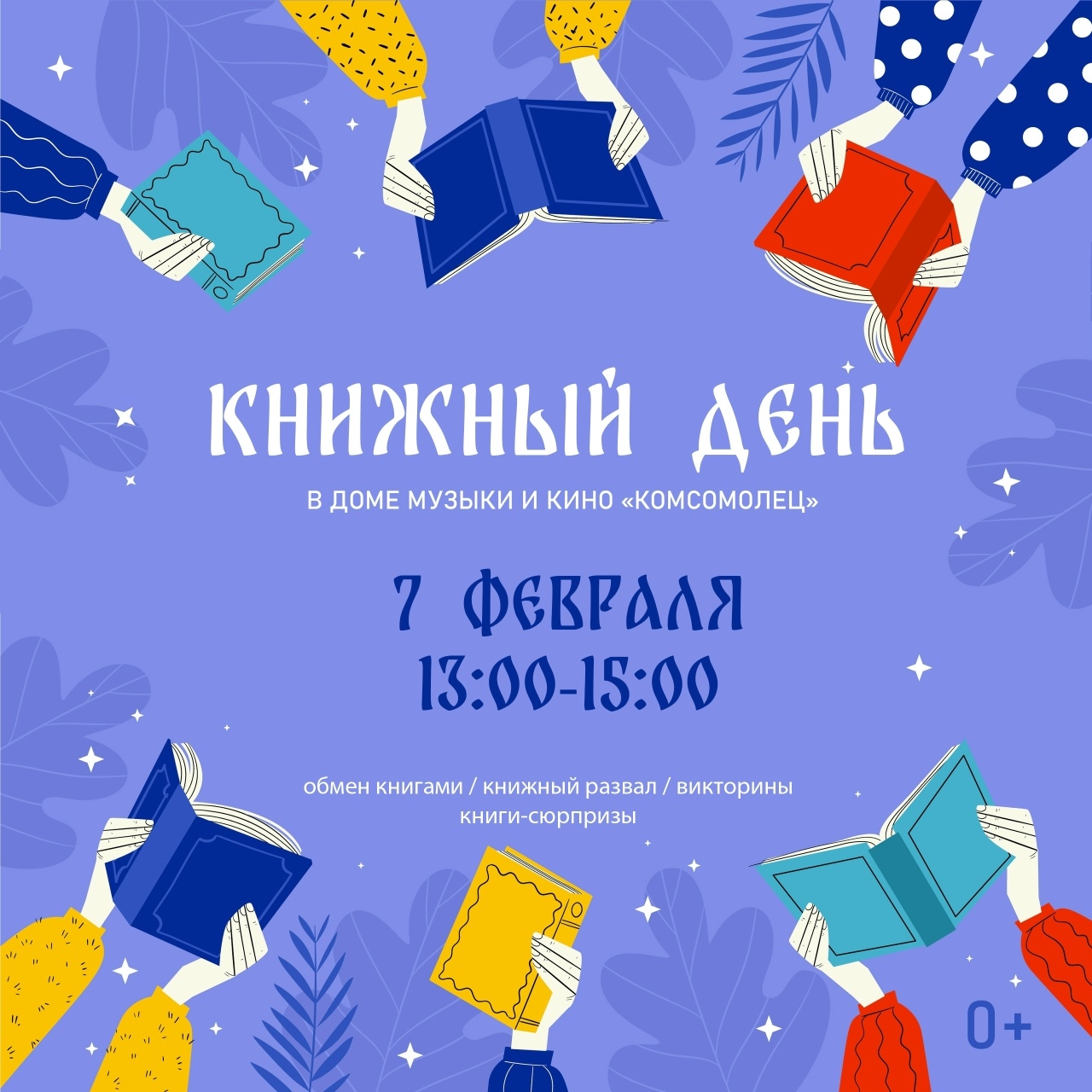 • 13:00–15:00 – Дом музыки и кино «Комсомолец» совместно с городскими библиотеками приглашает на «Книжный день» (0+).