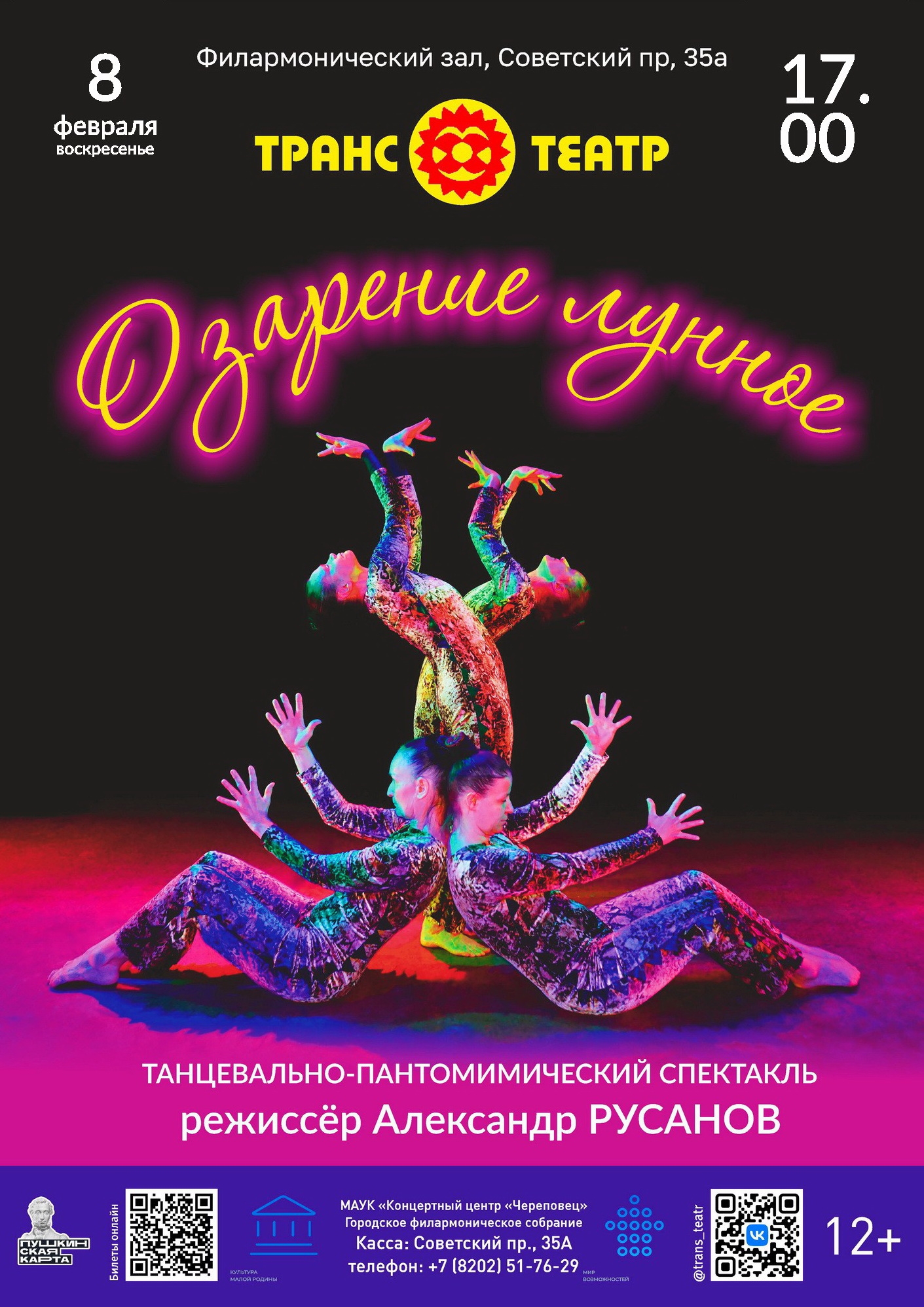 • 17:00 – транс-театр с танцевально-пантомимическим спектаклем «Озарение лунное» (12+) в Филармоническом зале (Советский пр., 35а).