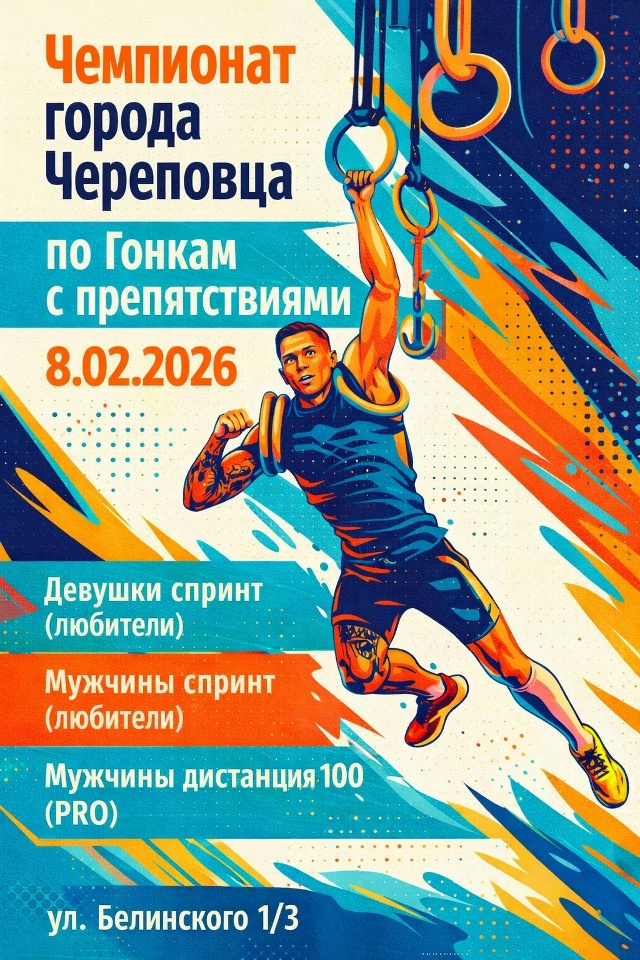 • 8:30 – открытый Чемпионат Череповца по гонкам с препятствиями (0+) на Белинского, 1/3 («Осьмирук»). Соревнования для спортсменов от 18 лет.