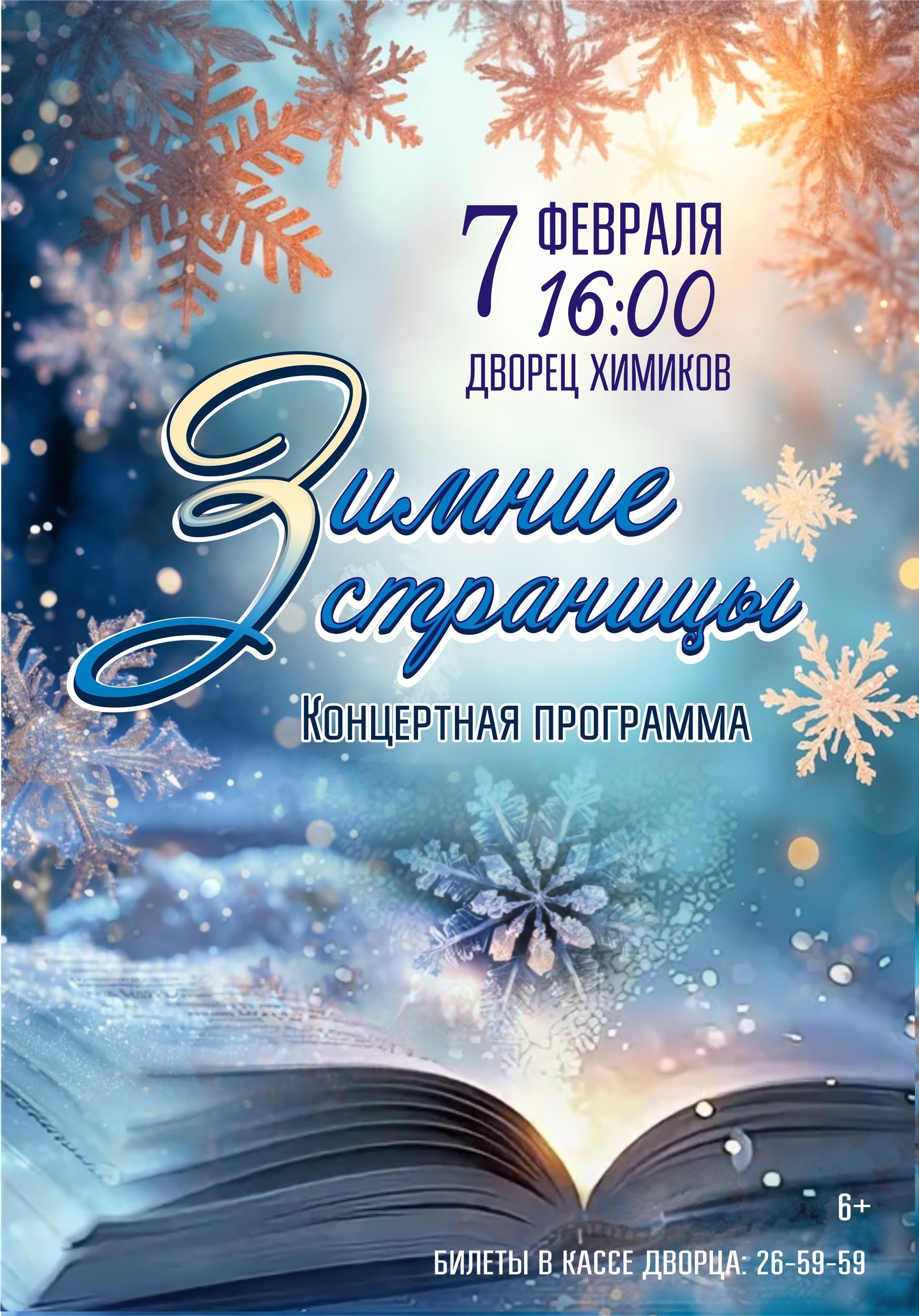 • 16:00 – во Дворце химиков концертная программа «Зимние страницы» (6+). В программе — лучшие зимние номера коллективов: студия современной хореографии и балет «Хобби», студия искусств и балет «Синергия», ТСК «Ритм», ТСК «БОМОНД», творческий центр «ВЕТЕР LIVE», ансамбль русской песни «Забава». Выступят Ксения Тюсова, творческая мастерская Ксении Тюсовой «Арт Клан» (солисты Лидия Снопикова, Милена Салимова и Евгения Бесова), Иван Белков, театр костюма «Ренессанс», Степан Васильев, Руслан Паташев.