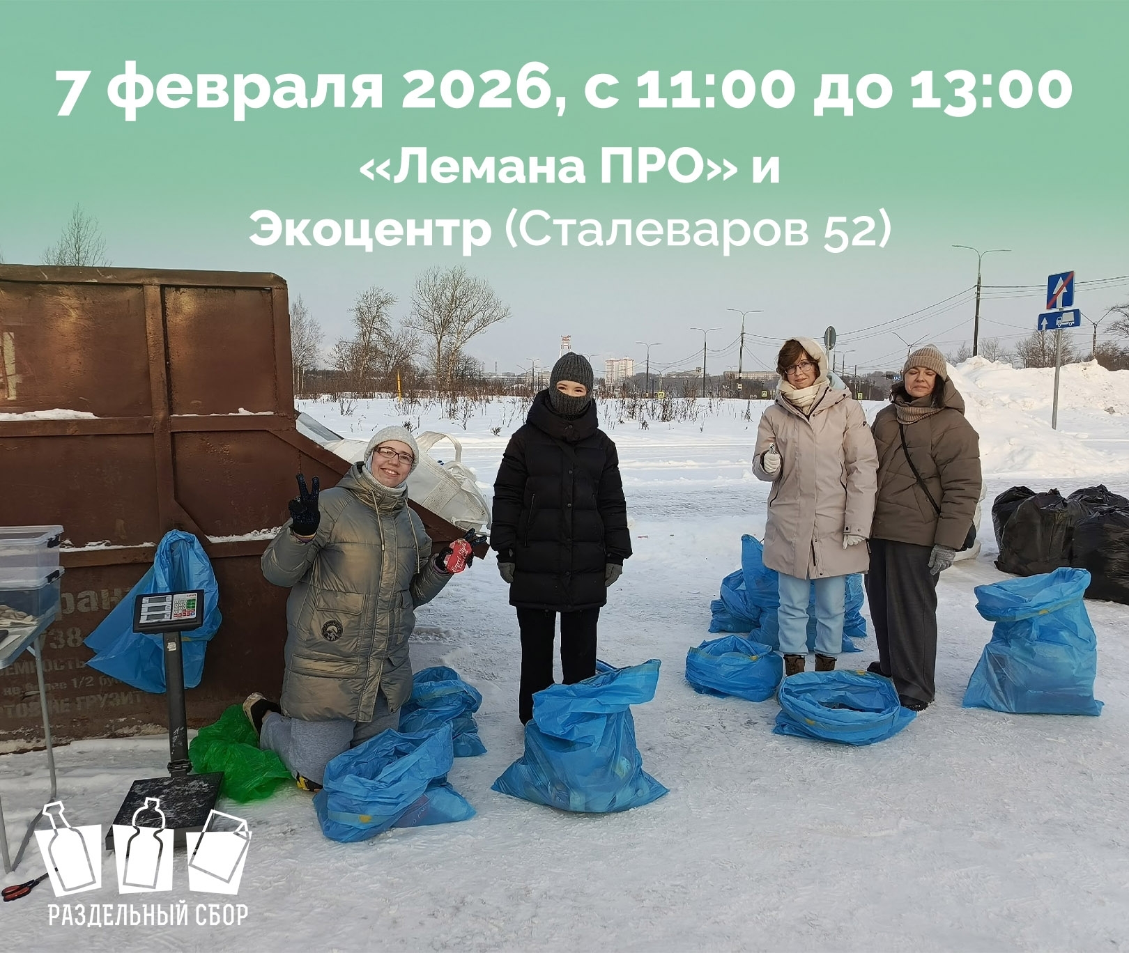 • 11:00–13:00 – акция по «РазДельному сбору» (0+) на двух площадках: парковка рядом с пунктом раздельного сбора «Лемана ПРО» и в Центре экологической культуры на Сталеваров, 52 (вход со двора).