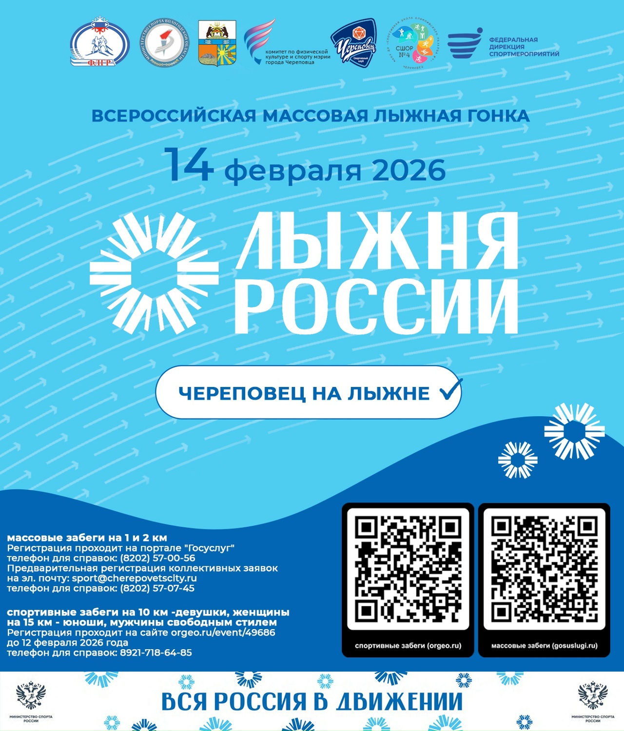 14 февраля в Череповце состоятся два спортивных праздника в рамках XLIV открытой Всероссийской массовой лыжной гонки «Лыжня России» (0+).