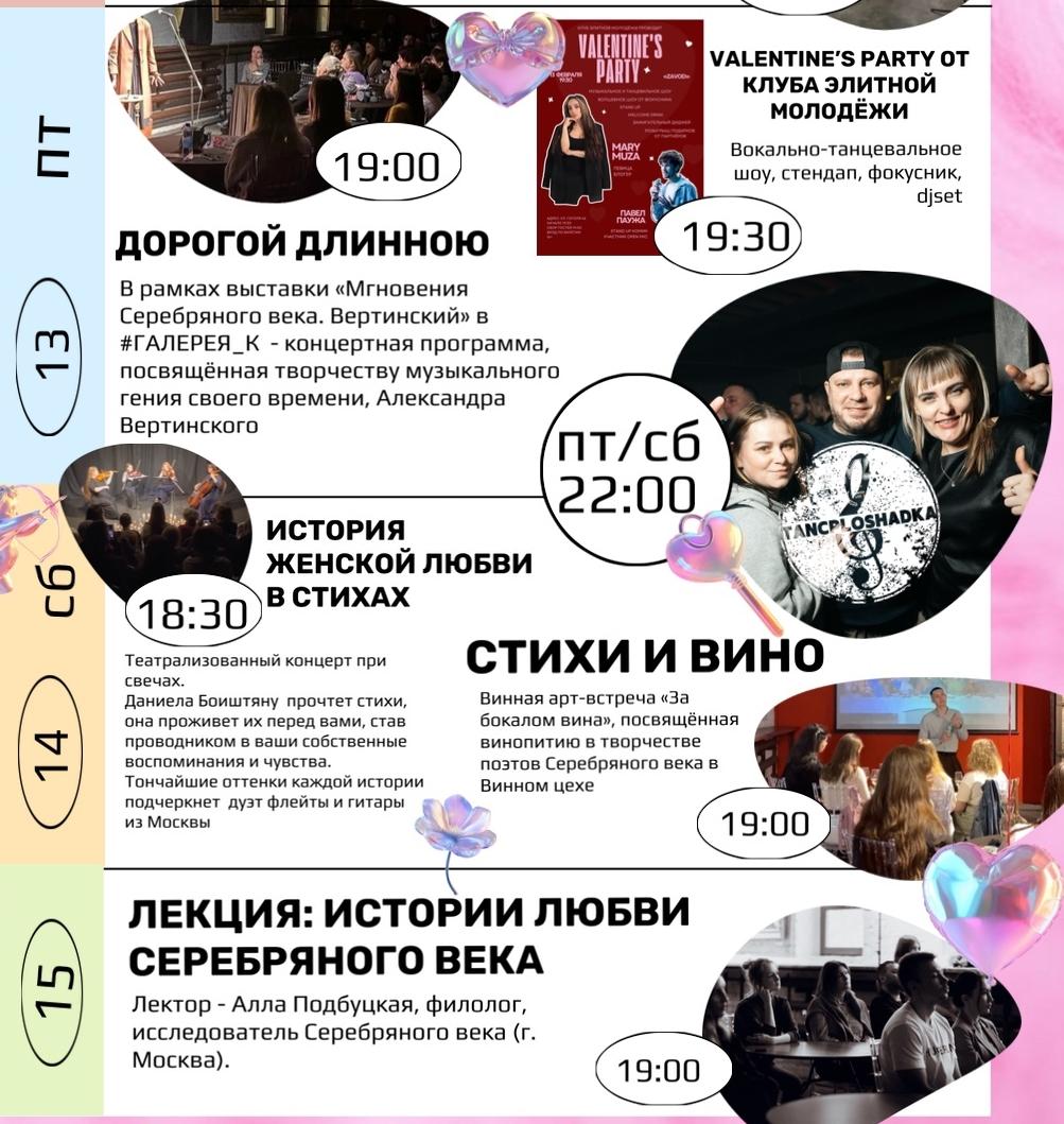 В 19:00 в арт-кластере «ZAVOD» концертная программа, посвященная творчеству Александра Вертинского «Дорогой длинною» (16+). В 19:30 на основной площадке Valentine’s party: вокально-танцевальное шоу от MARY MUZA, выступление стендап-комика Павла Паужа из Вологды, шоу Фокусника, DJ-сет, танцы до позднего вечера.