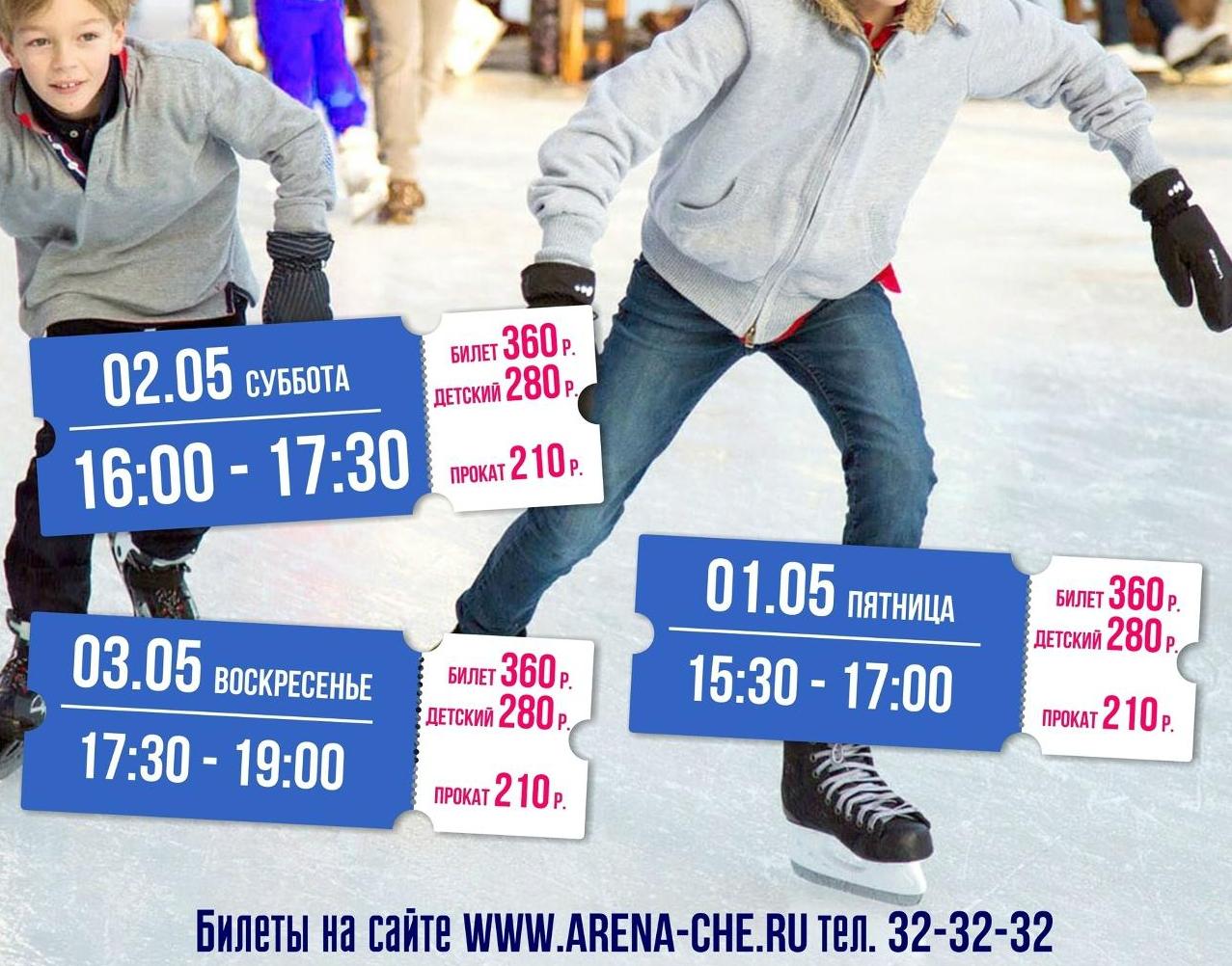 Массовые катания на льду (0+) в СКЗ «Алмаз»: 1 мая — в 15:30, 2 мая — в 16:00, 3 мая — в 17:30.
