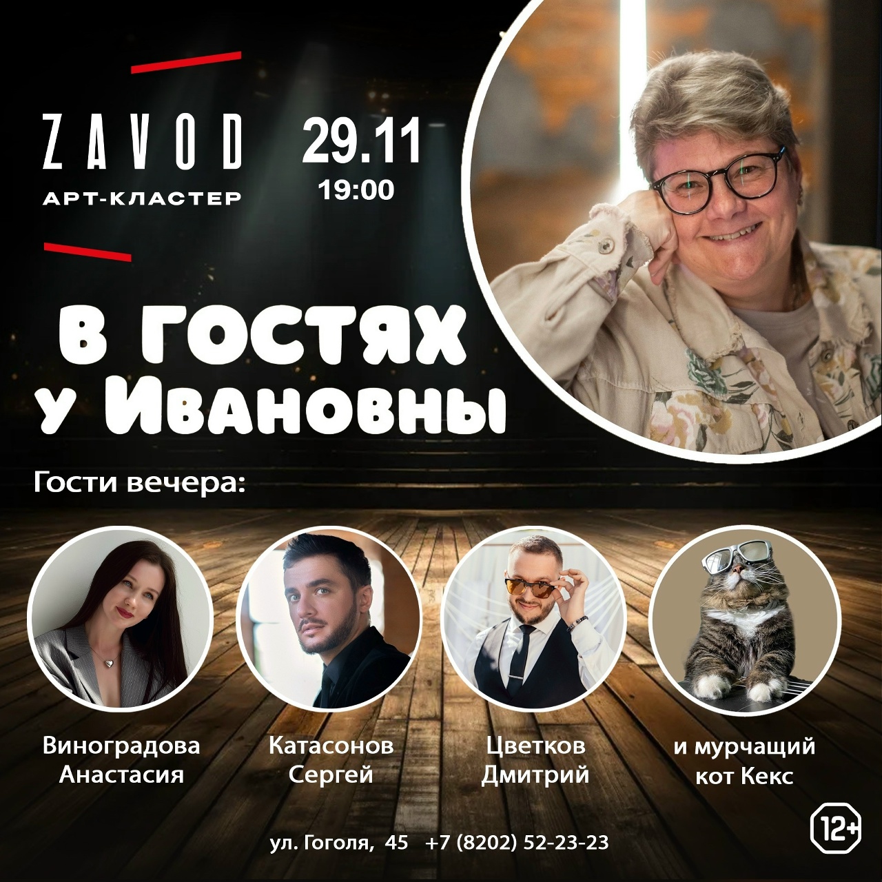 В 17:00 в «Арт-кластере ZAVOD» (ул. Гоголя, 45) — шоу-проект «В гостях у Ивановны» (12+).