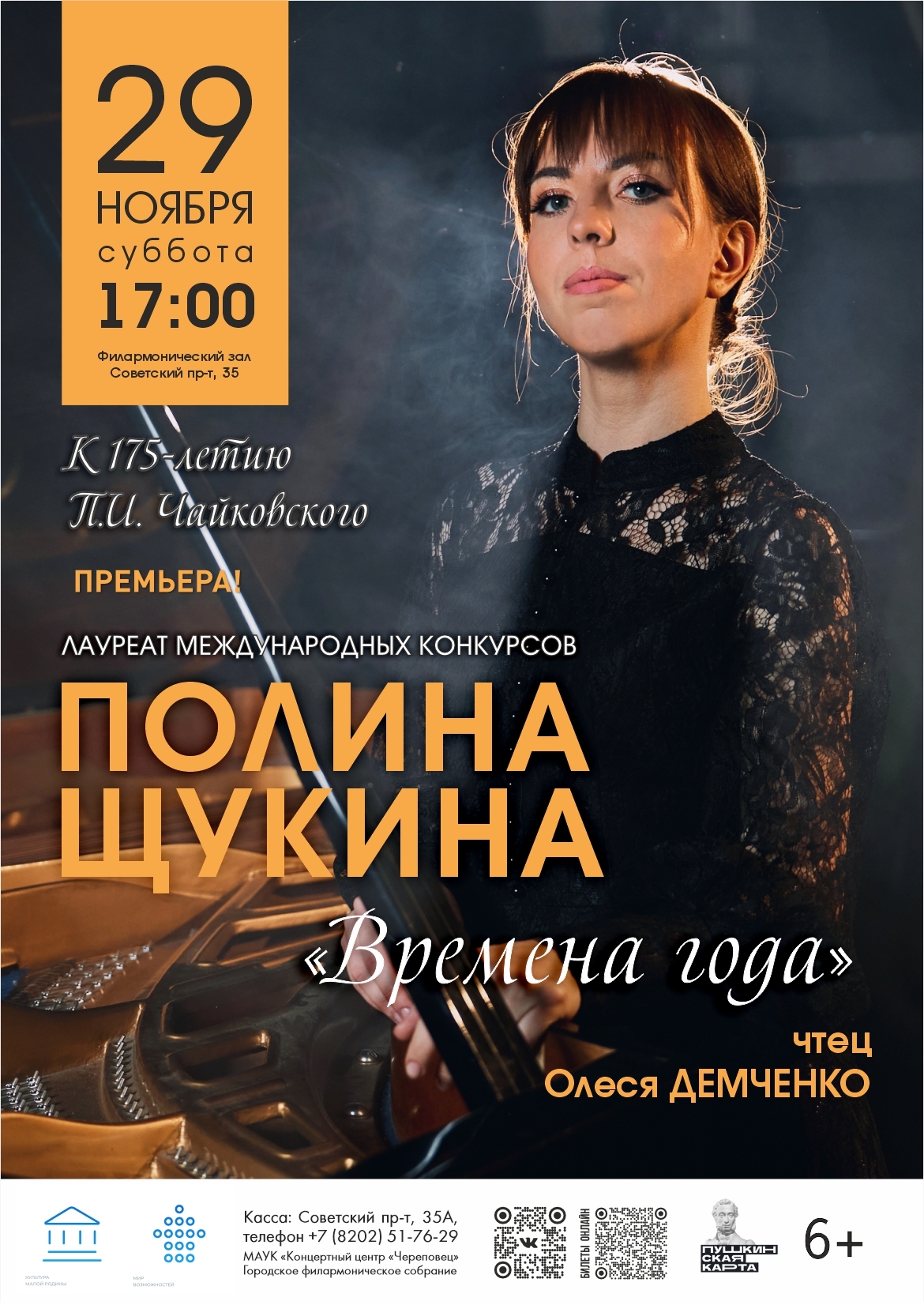 В 17:00 в Филармоническом зале (Советский пр., 35а) — фортепианный цикл П.И. Чайковского «Времена года» (6+) в исполнении Полины Щукиной.