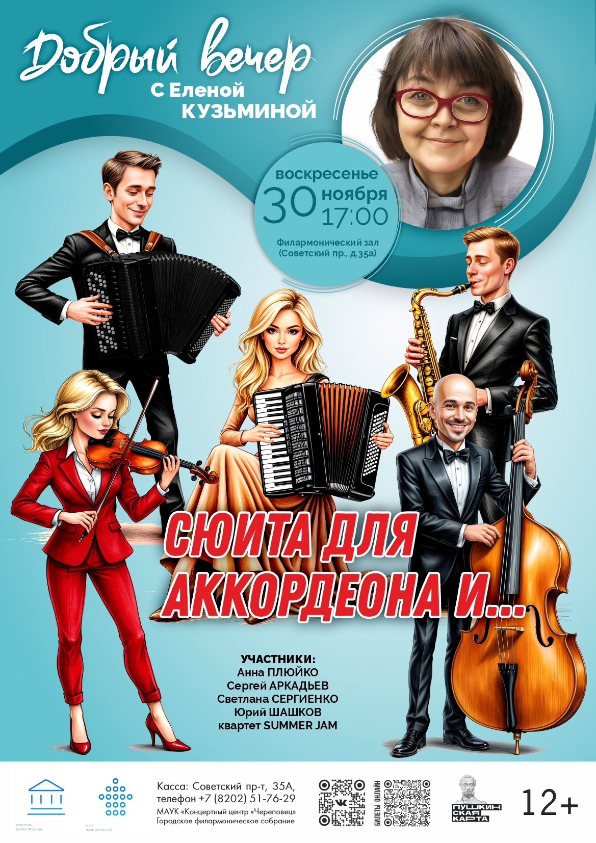 В 17:00 в Филармоническом зале — концерт инструментальной музыки «Сюита для аккордеона и...» (6+) из цикла «Добрый вечер с Еленой Кузьминой».