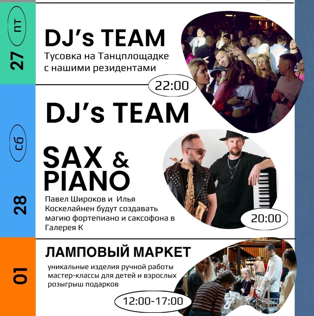 - 12:00–17:00 — «Ламповый маркет» (0+): мастер-классы, развлечения, розыгрыши. «Галерея К».