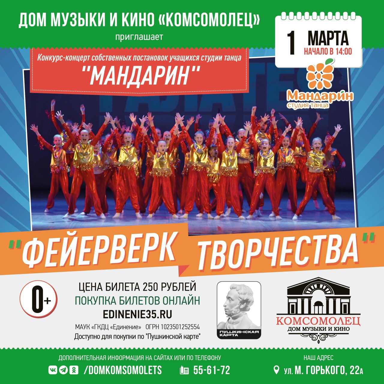 - 14:00 — конкурс-концерт студии танца «Мандарин» (0+). Дом музыки и кино «Комсомолец».