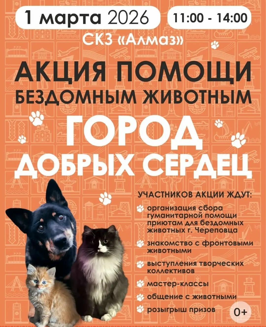 - 11:00–14:00 — акция «Город добрых сердец» (0+): сбор помощи для бездомных животных в День кошек. «Алмаз».