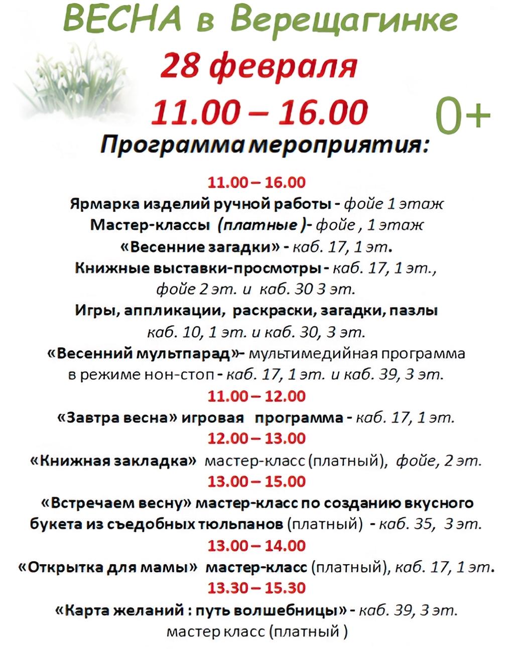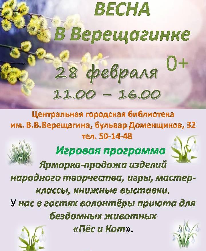 - 11:00–16:00 — «Весна в Верещагинке» (0+): ярмарка, игры, мастер-классы. Центральная библиотека им. В. В. Верещагина. Вход свободный.