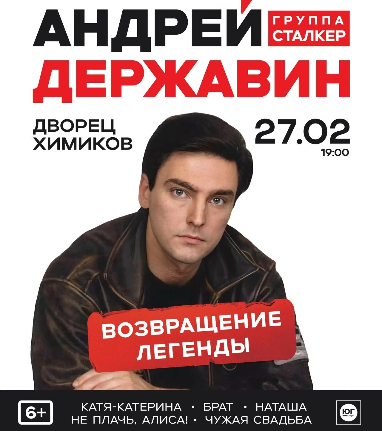 - 19:00 — концерт «Возвращение легенды» (6+). Андрей Державин и группа «Сталкер». Дворец химиков.