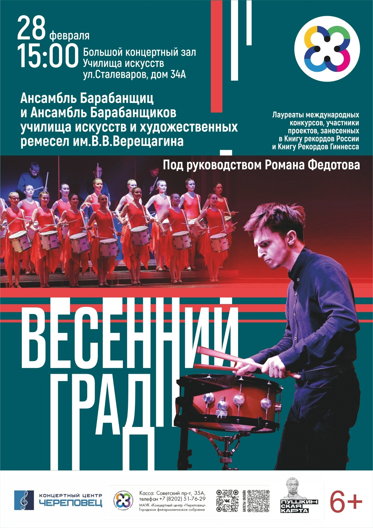 - 15:00 — концерт «Весенний град» (6+). Ансамбли барабанщиц и барабанщиков. Большой зал Училища искусств.