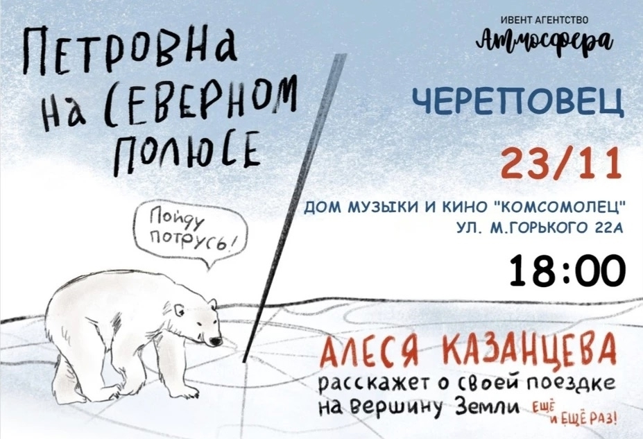 В 18:00 в ДМиК «Комсомолец» (ул. М. Горького, 22А) — творческая встреча с Алесей Казанцевой, которая расскажет о своей поездке на вершину Земли (12+). Подробнее по телефону: 8 (8202) 255-61-72.