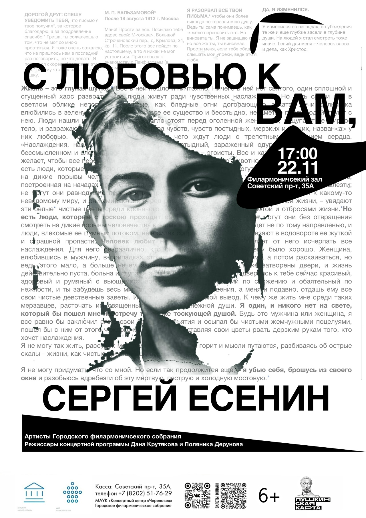В 17:00 в Филармоническом зале (Советский пр., 35а) — концертная программа «С любовью к Вам, Сергей Есенин» (6+). Исполнители: солисты Городского филармонического собрания и студенты Череповецкого государственного университета направления «Режиссура театрализованных представлений и праздников».