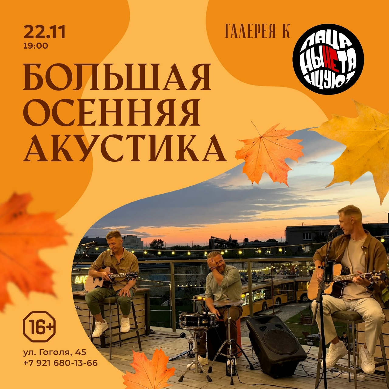 В 19:00 в «ГАЛЕРЕЯ_К» (ул. Гоголя, 45) — «Большая осенняя акустика» (16+). В программе — лучшие хиты, переложенные на акустические струны: Агутин, Браво, Пицца, Звери, Секрет, Сплин, IOWA, Би-2, Depeche Mode и другие.