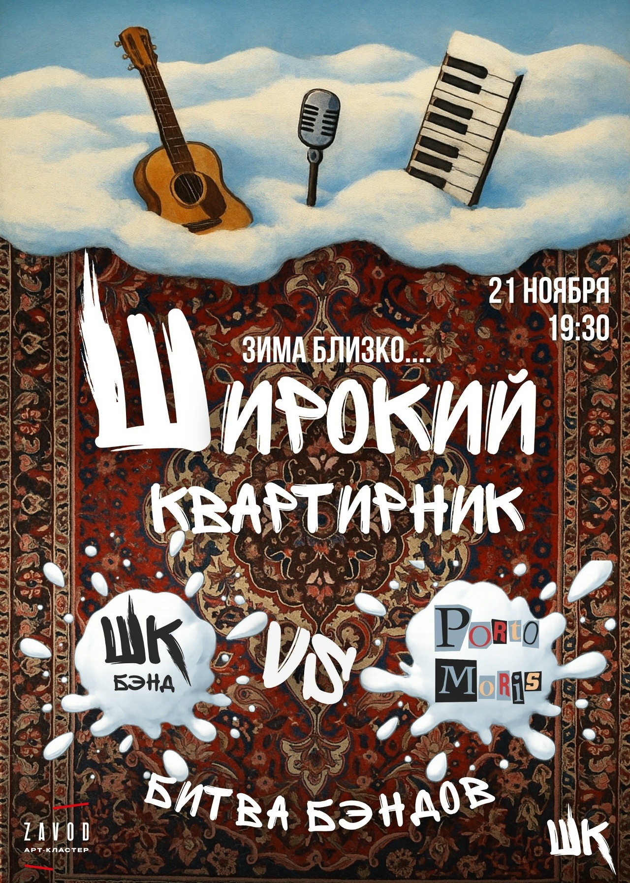 В 19:30 в «Арт-кластере ZAVOD» (бывший PIVZAVOD, ул. Гоголя, 45) состоится финальный «Широкий Квартирник» (16+). Столичная группа «Porto Moris» исполнит известные песни и свои сочинения. «ШК Бэнд» и «Porto Moris» сразятся в музыкальном баттле в разных жанрах: рок, поп, песни из фильмов и авторские композиции.
