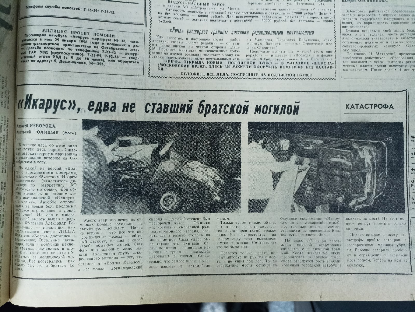 «Только чудом можно объяснить то, что из почти двух сотен пассажиров погиб только один, — сообщал корреспондент «Речи». — Его распростертое на речном льду тело выглядело жутко и нелепо. Смотреть на это не было сил. Остается только гадать, почему автобус не рухнул с моста и не ушел под лед. То ли ограждение моста остановило безумное скольжение «Икаруса», то ли фонарный столб».