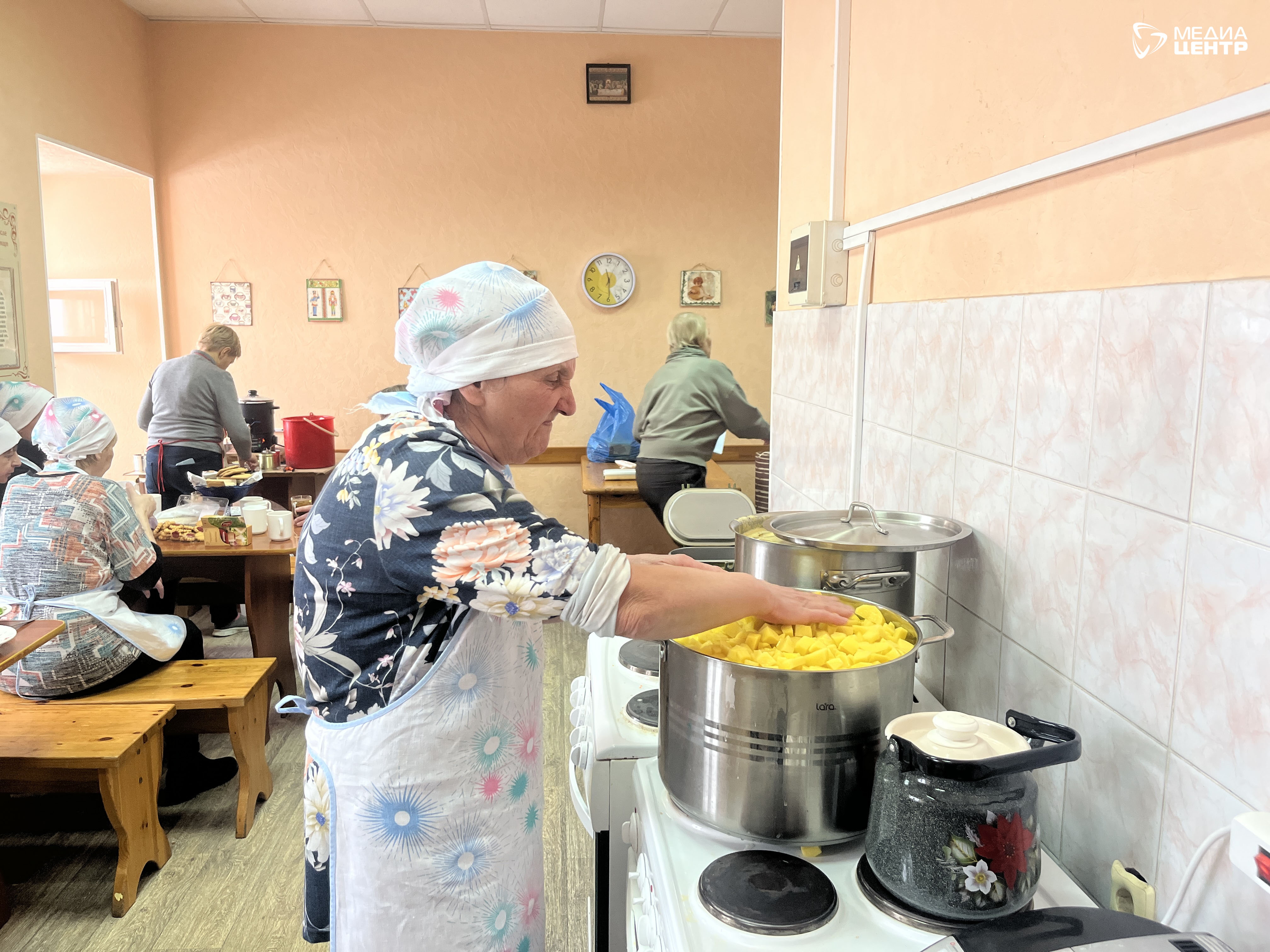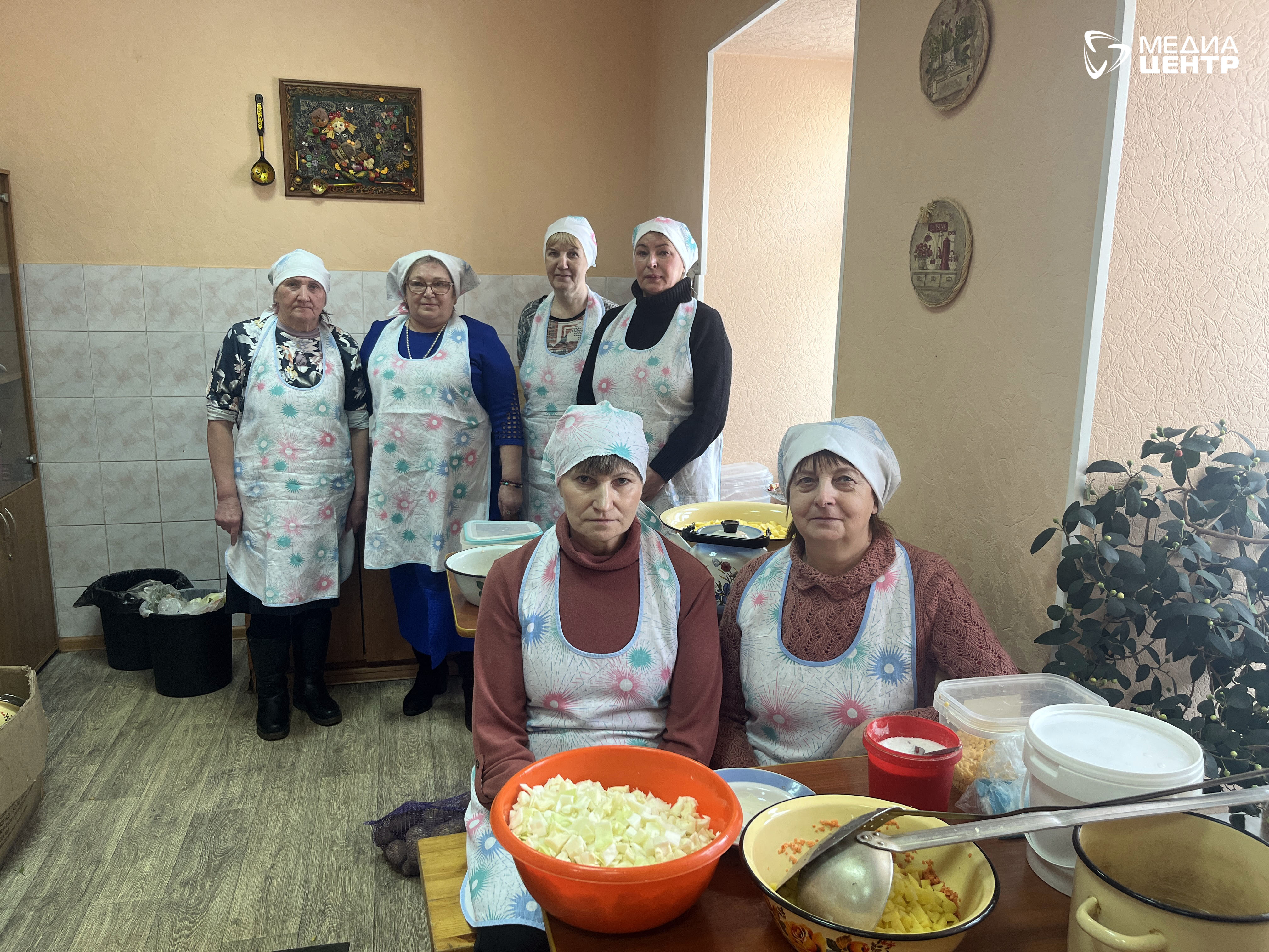 Проходим на кухню. В небольшом помещении уютно и тепло, как бывает там, где собрались родственные души. На плите кипит борщ в кастрюле ведра на полтора. На столах — тазики с нарезанными салатами. Знакомимся.