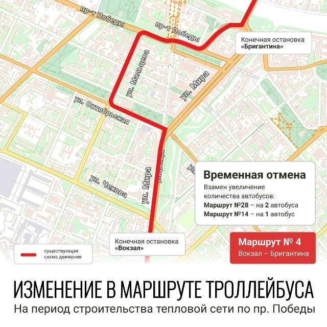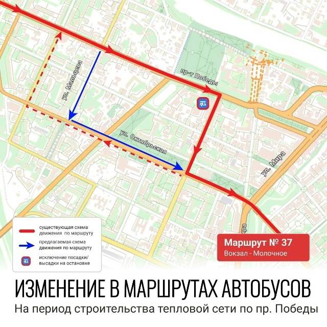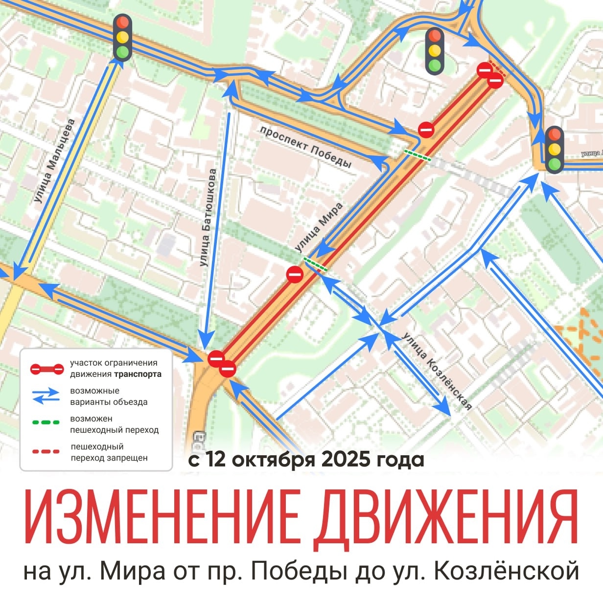 Для улучшения транспортной ситуации в центре города с 12 октября будет введено двустороннее движение по улице Мира от Козлёнской до проспекта Победы. Движение будет организовано по четной стороне улицы в обоих направлениях. Кроме того, для транспорта станет доступна часть проспекта Победы от Торговой площади до улицы Мира.