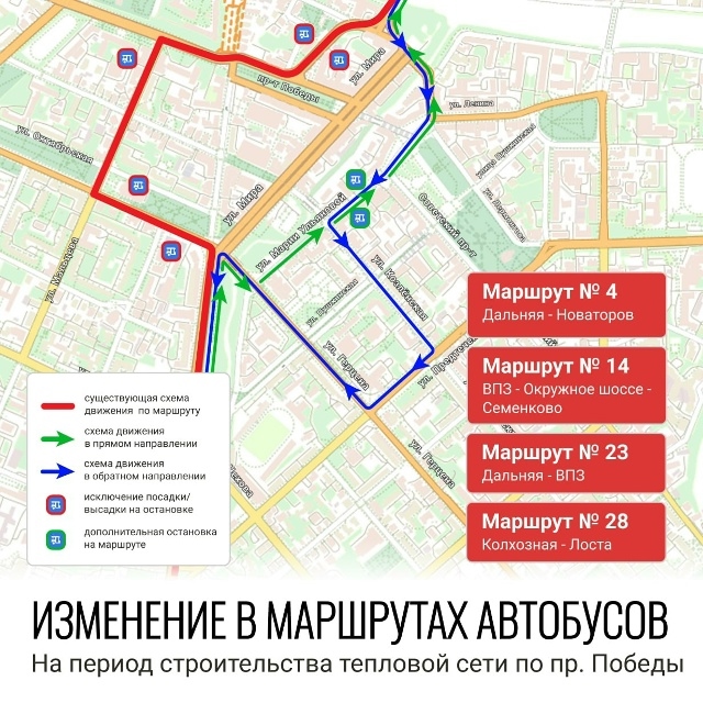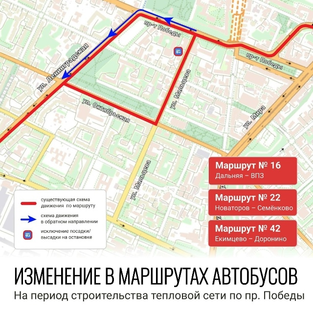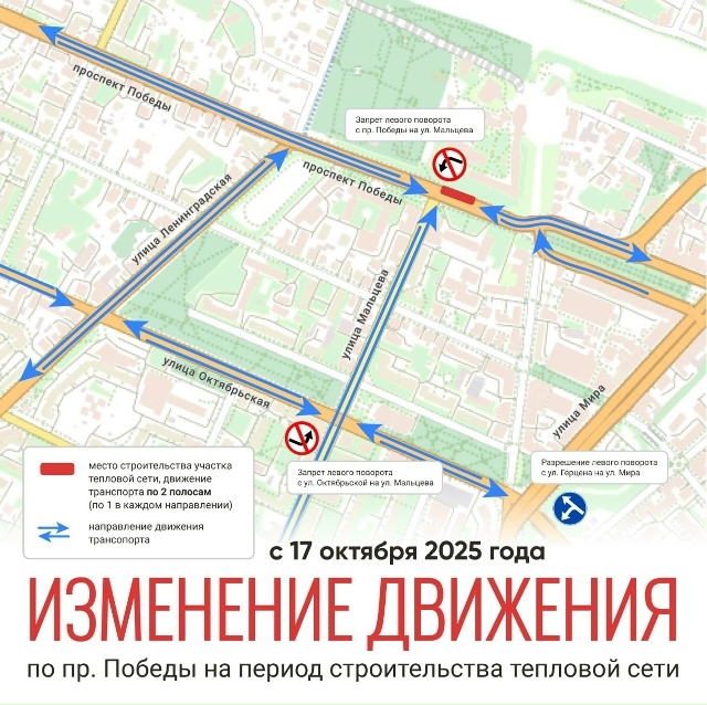 На проспекте Победы, в районе дома № 33, вблизи перекрёстка с улицей Мальцева, будет сужен участок дороги с четырёх до двух полос – по одной полосе в каждом направлении. Кроме того, будут запрещены левые повороты на улицу Мальцева со стороны проспекта Победы и улицы Октябрьской при движении с Ленинградской. Левый поворот на улицу Мира с улицы Герцена останется разрешённым.
