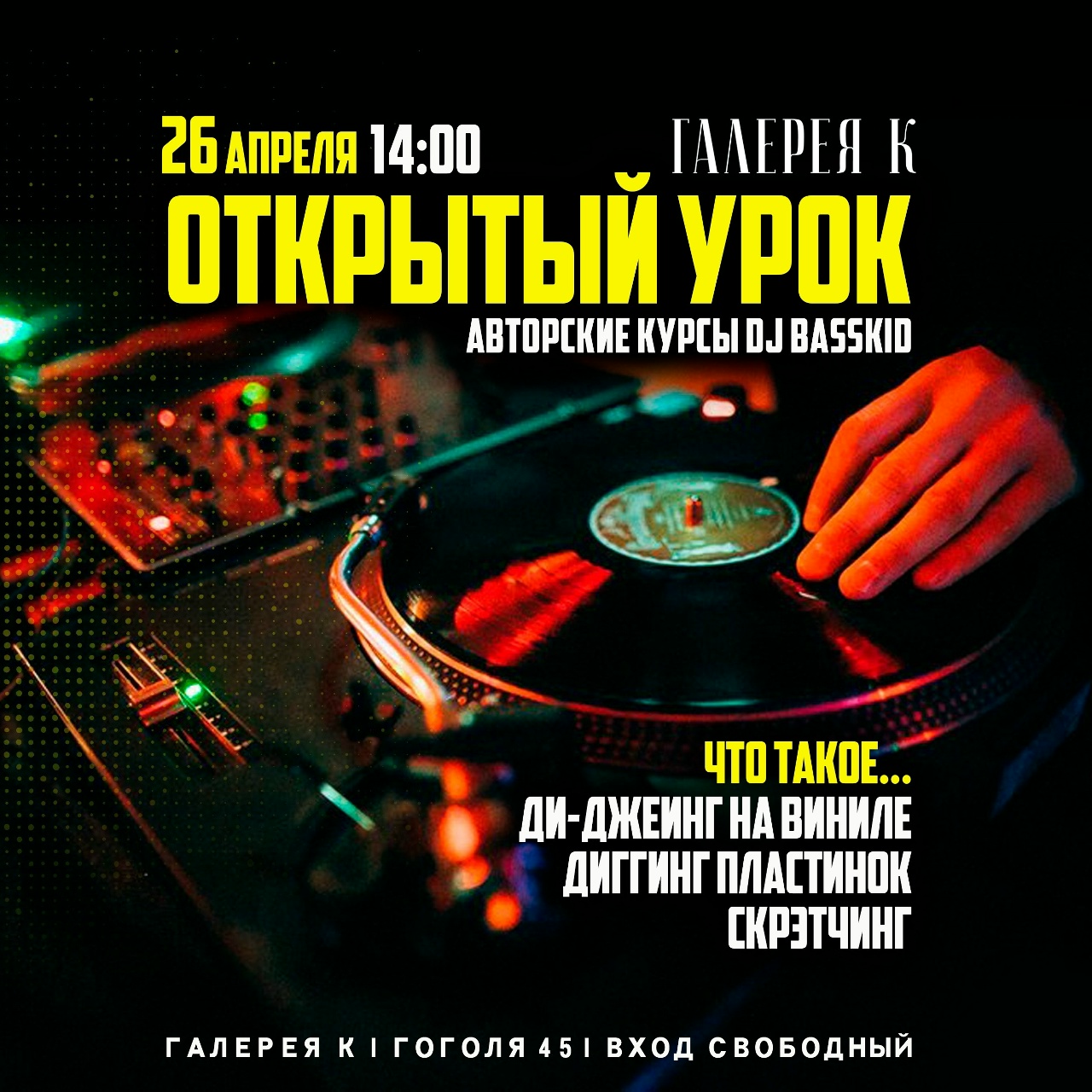 14:00 - открытый урок по теме «Виниловый Ди-Джеинг» в Галерея К (18+).