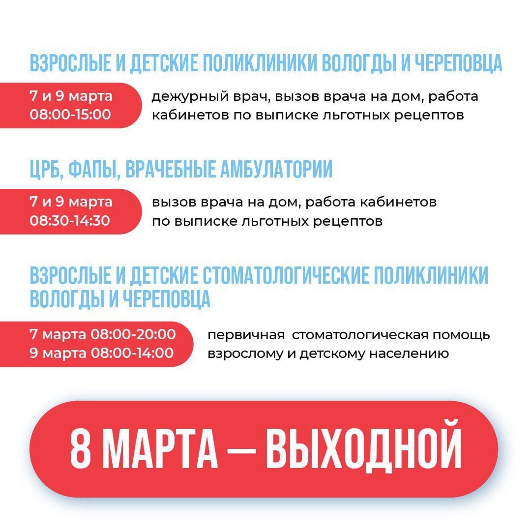 - 7 и 9 марта — с 8:00 до 15:00 (дежурный врач, вызов на дом, выписка льготных рецептов); 8 марта — выходной.