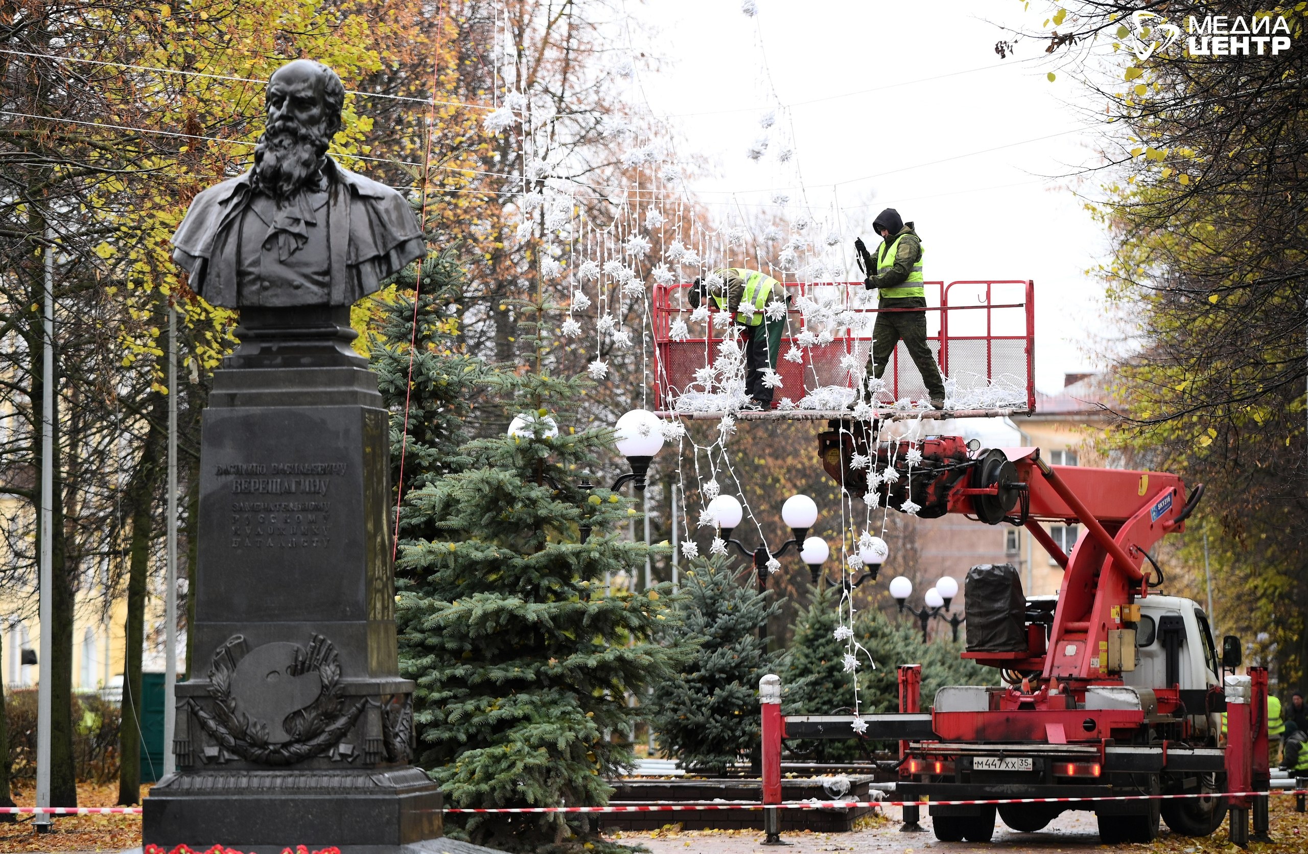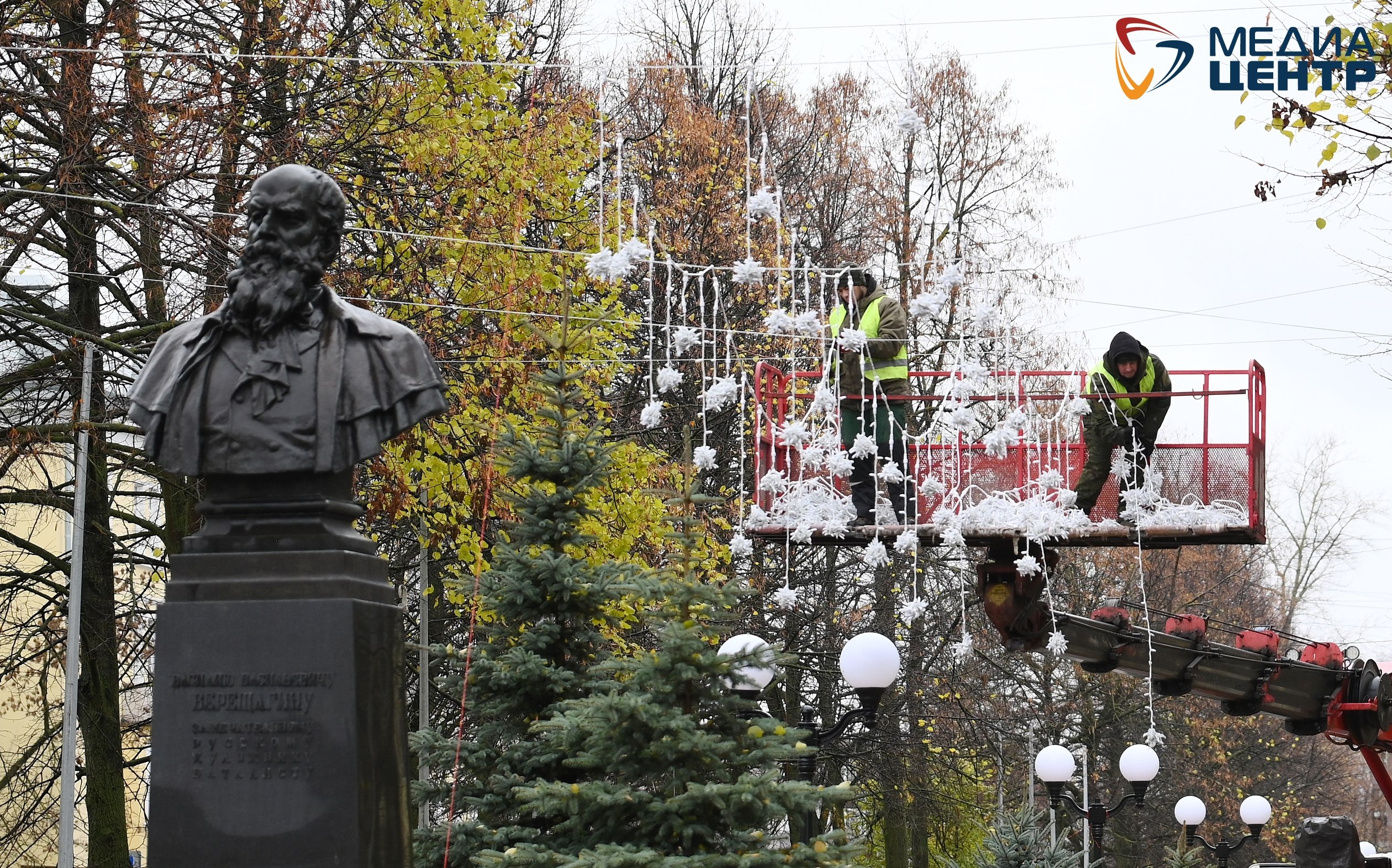 В сквере Верещагина развешивают световые декорации. Видимо, гирлянды станут украшением обновленного сквера и на День города, и на Новый год.