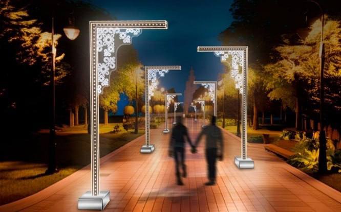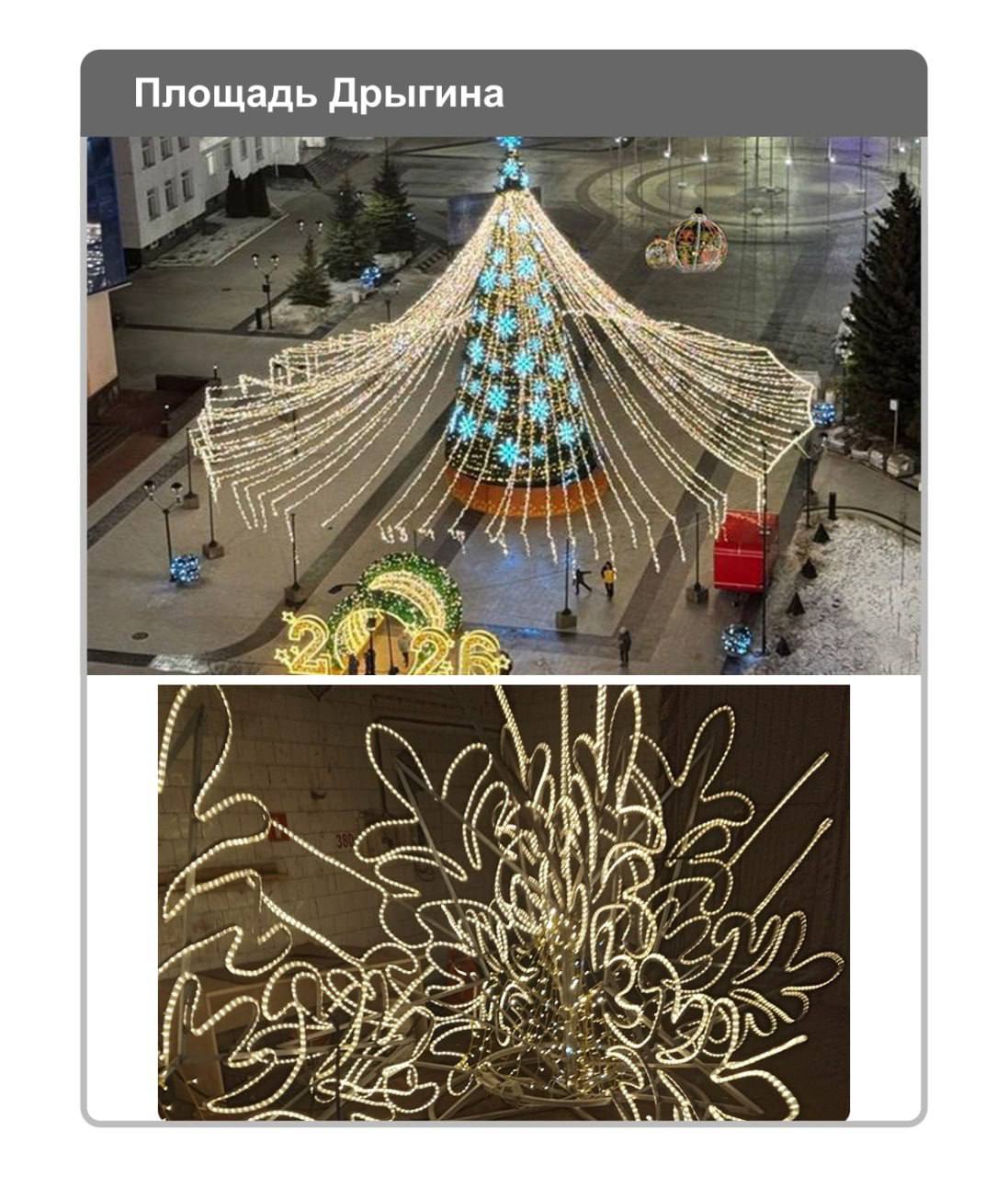На площади Дрыгина установят композицию «2026» и большую ель. Бульвар на проспекте Победы украсят фонтаном из огней, аркой «Олени» и гирляндами. Пушкинская аллея засияет 14 световыми полупорталами. Рядом с ЦУМом разместят звёзды, декоративные ели и фонари.