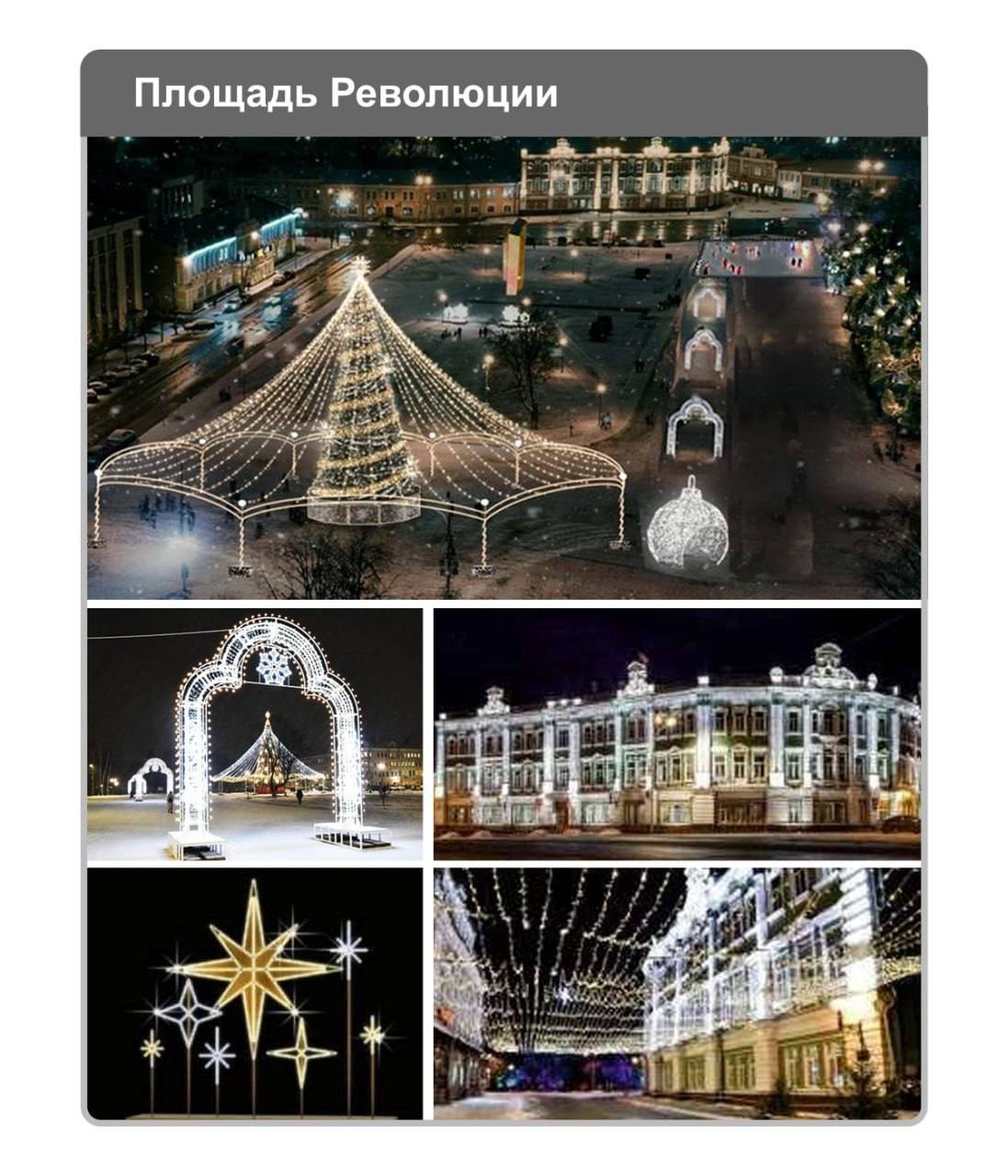На Кремлёвской площади появится 20-метровая ель, световые арки и украшенные ярмарочные домики. В Детском парке и на площади Революции зажгутся гирлянды, а центральная ель с шатром дополнится световыми шарами, снежинками и арками.