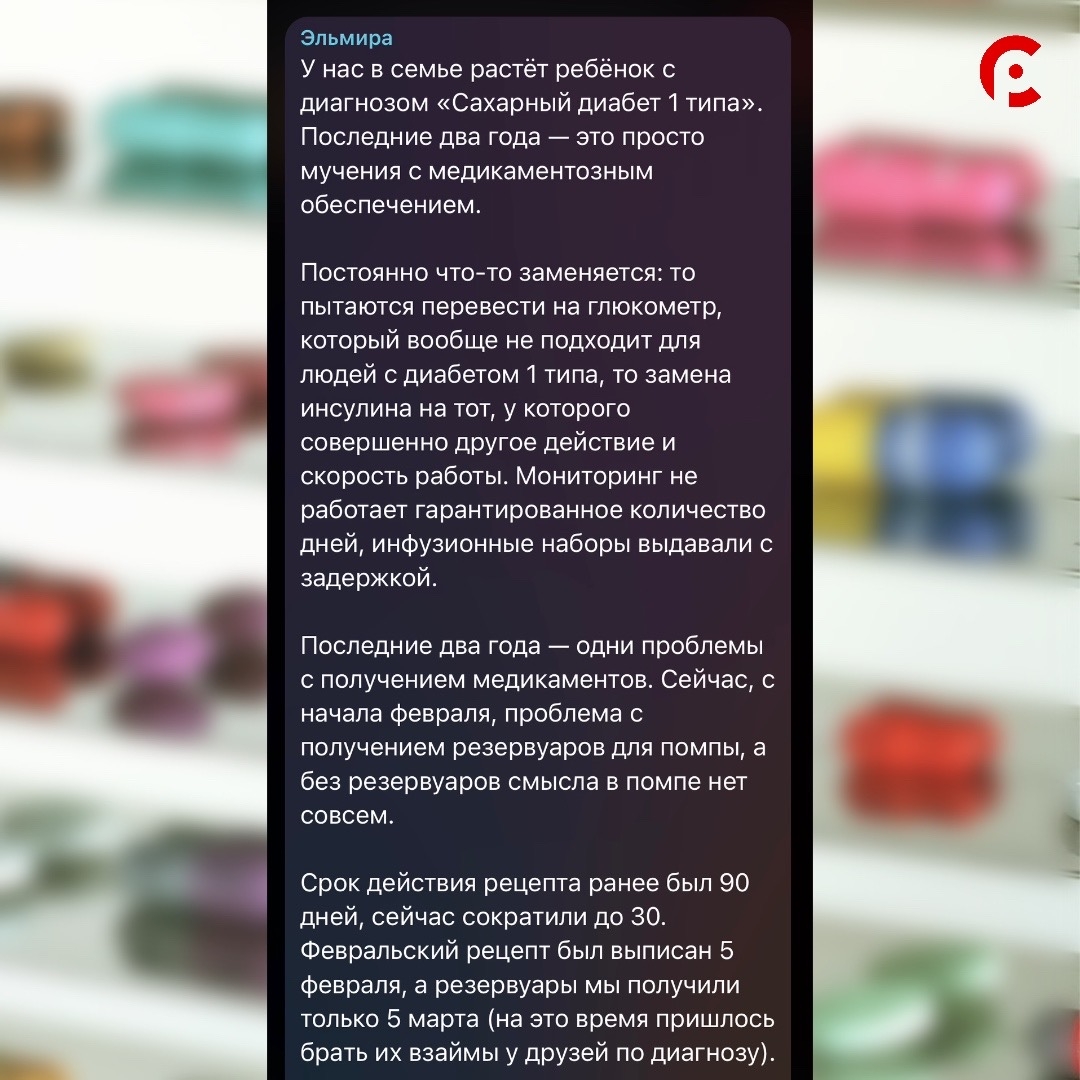 «Постоянно что-то заменяется: то пытаются перевести на глюкометр, который вообще не подходит для людей с диабетом 1 типа, то меняют инсулин на тот, у которого совершенно другое действие и скорость работы. Мониторинг не работает гарантированное количество дней, инфузионные наборы выдавали с задержкой», — отмечает вологжанка.