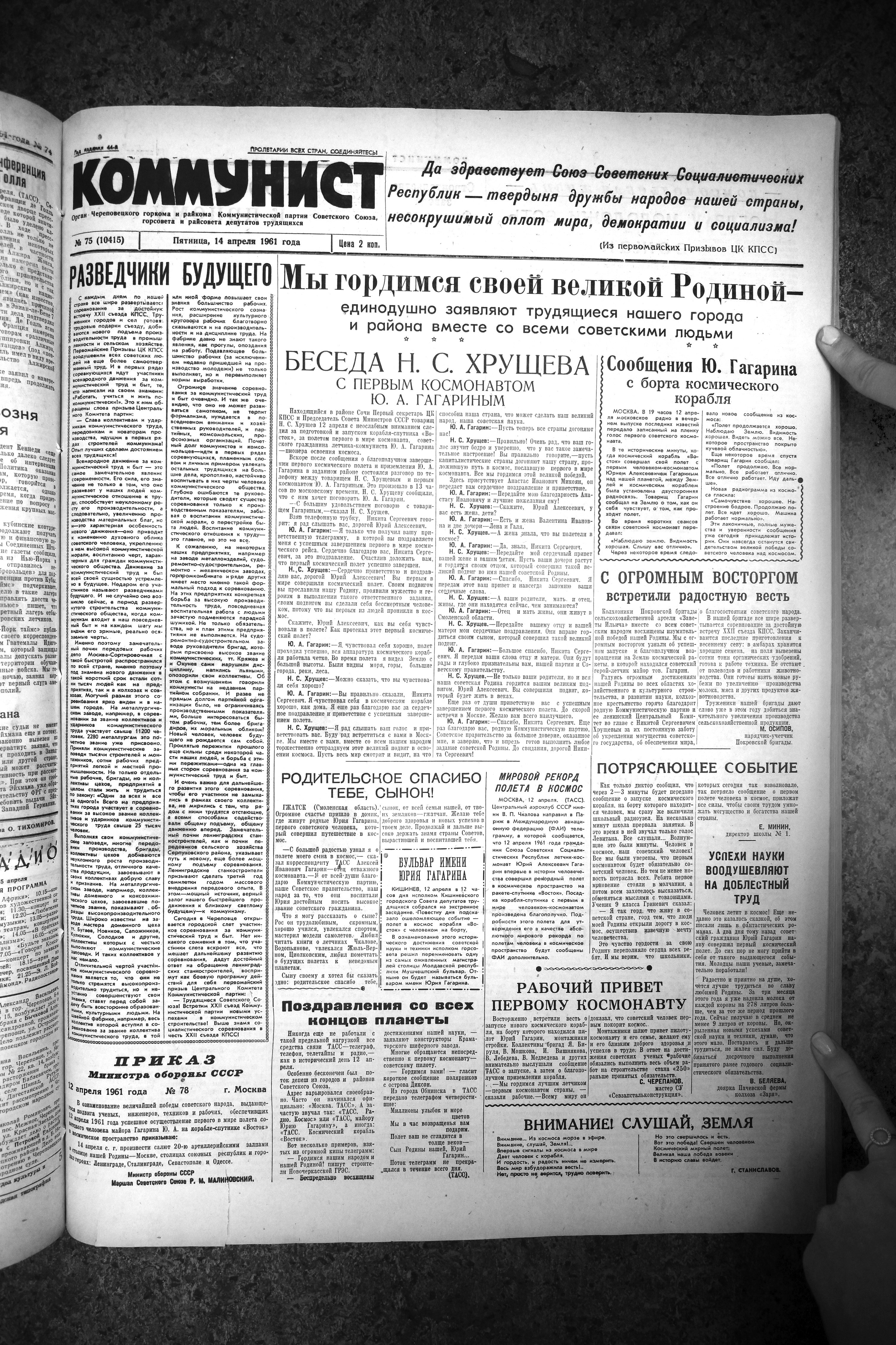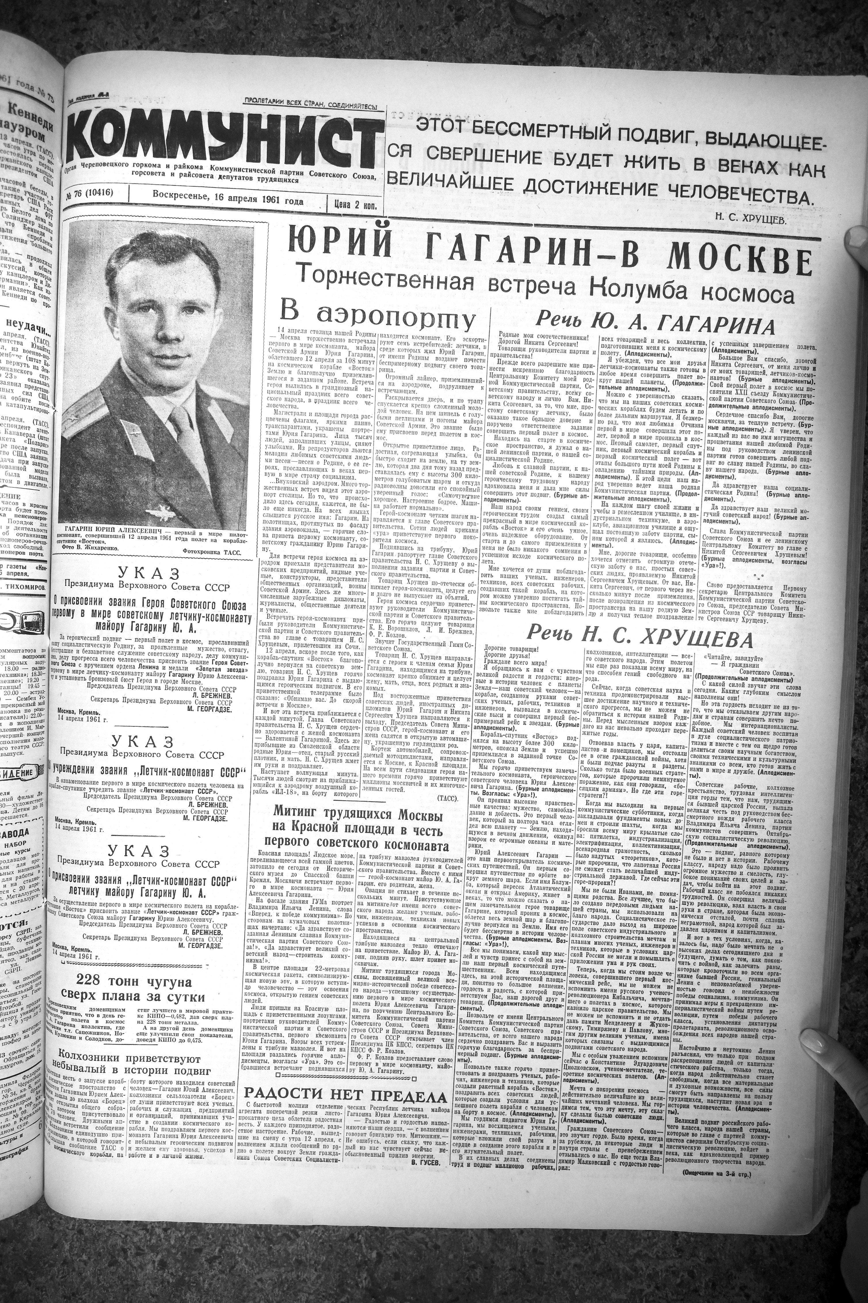 «Волнующая весть о полете в космос советского человека с быстротой молнии облетела наш город, — сообщал «Коммунист». — В заводских цехах, на строительных площадках — всюду проходят многолюдные митинги, череповчане выражают свое восхищение грандиозным достижением нашей науки и техники».