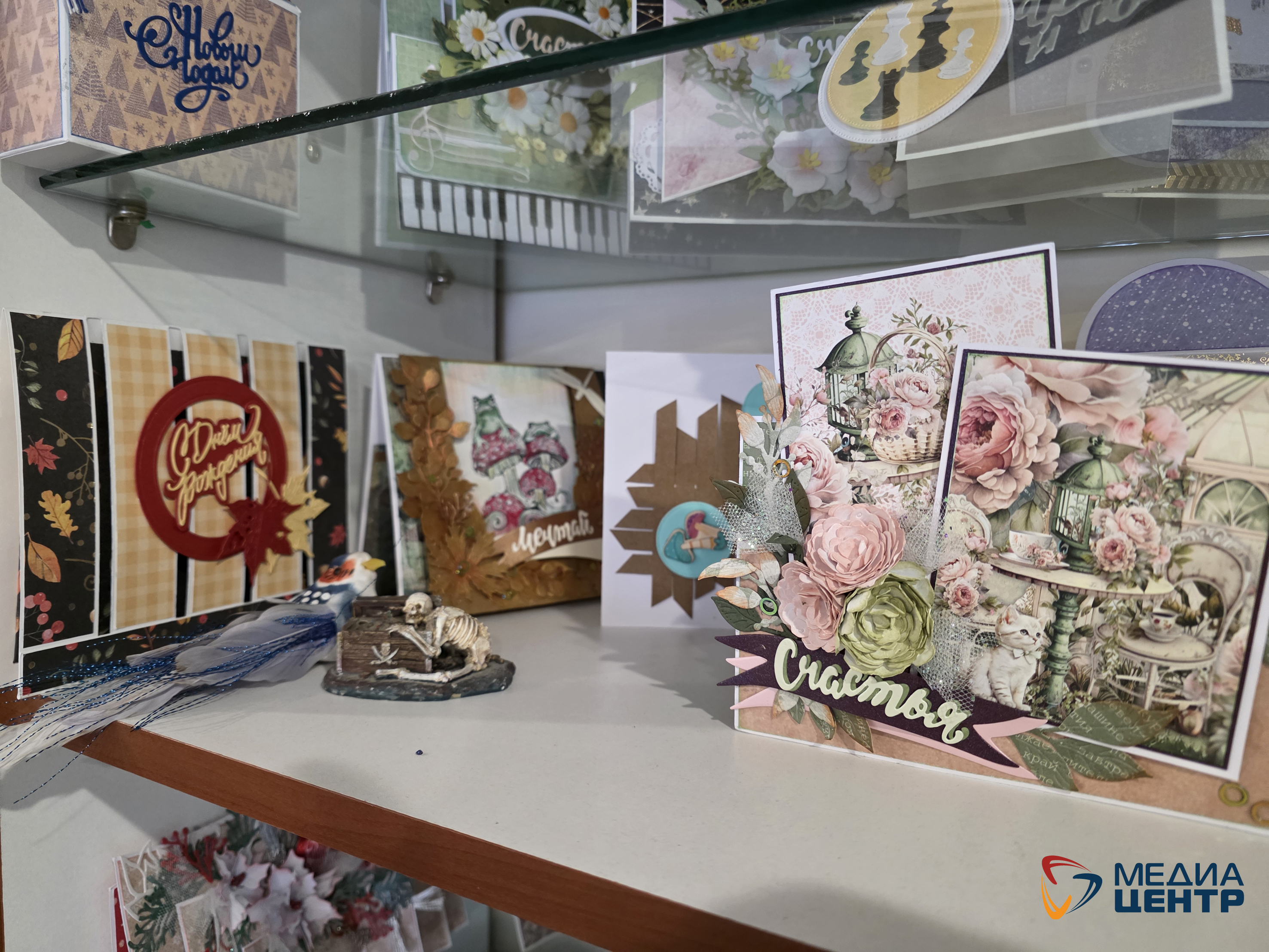 На столе у Ольги Глуховой нас привлекли изделия ручной работы — открытки, шкатулки, новогодние игрушки — из бумаги и бересты. Одно из основных ее увлечений — скрапбукинг (в переводе с английского «изготовление книг из вырезок»). С его помощью можно своими руками сделать поздравительную открытку, оформить фотоальбом. Прелестный подарок на день рождения или к иной памятной дате. Такие мелочи украшают нашу жизнь, делают окружающее нас пространство эстетичным.