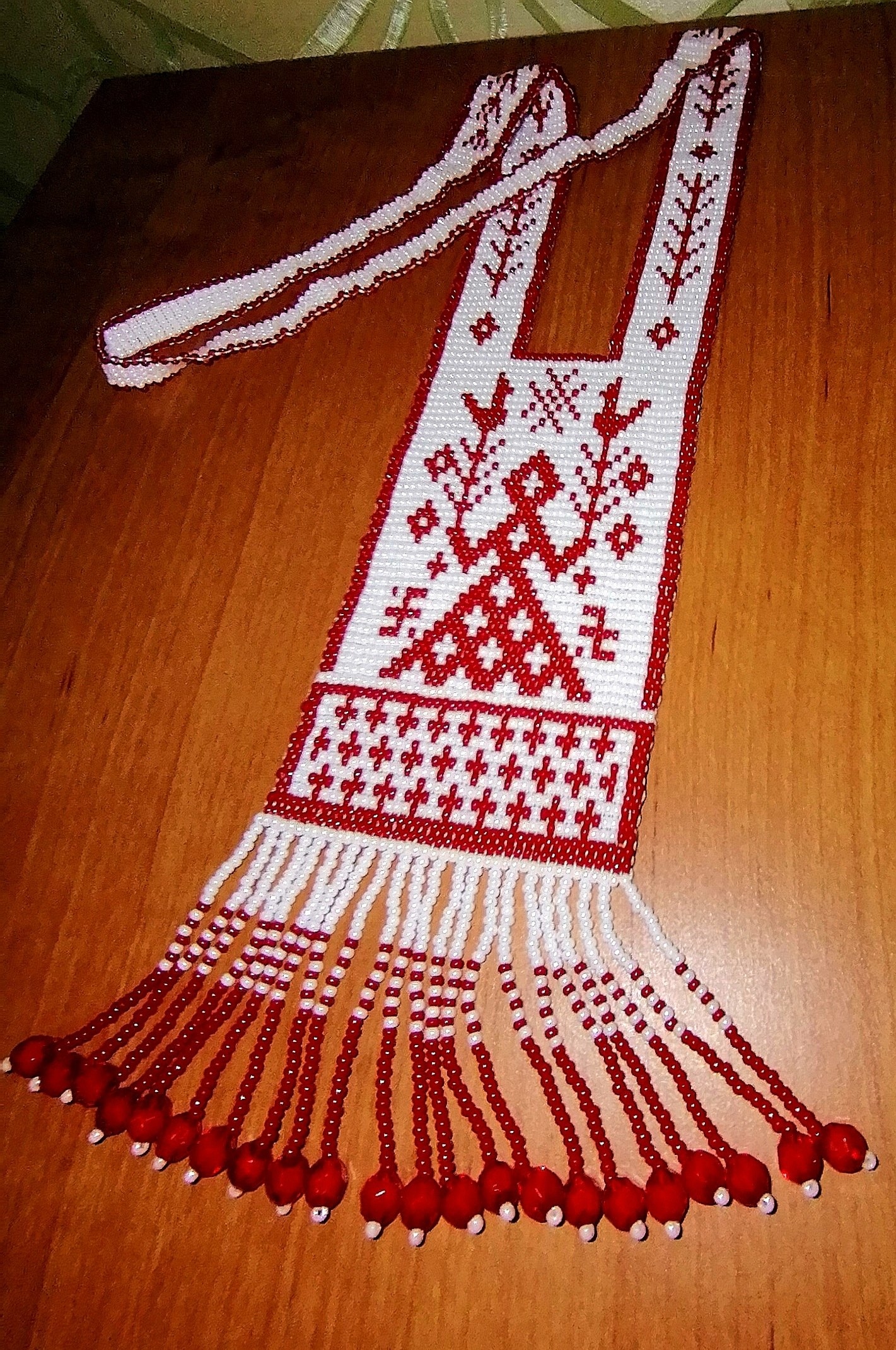 — Да, это я делала сама, — говорит наша собеседница. — Называется «гердан» — украшение из бисера в виде плоской узкой тесьмы, его можно носить с кулоном или медальоном. Это длинная лента с орнаментом, которую женщины носили на шее. Изначально у славян такие ленты использовались как обереги. Очелье — повязка на голове, которую в Древней Руси носили как женщины, так и мужчины. Причем молодые, девушки и парни, надевали на непокрытую голову: на косы, на волосы. Женщины постарше прежде покрывали голову платком. Очелье могло быть повседневным (из крапивных нитей) или праздничным: такое надевали на свадьбу, встречу, важные события. Практическое предназначенье очелья — удерживать челку и волосы по бокам. Считалось, что это и оберег, который защищает от злых духов.