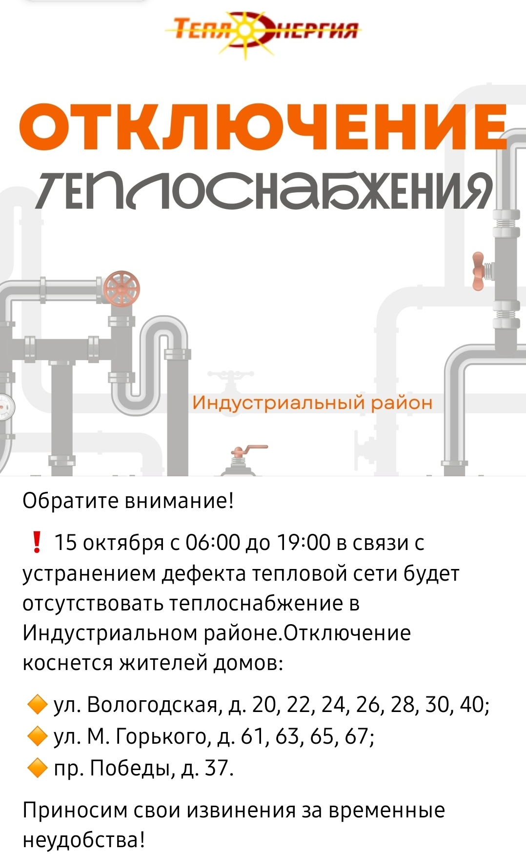 МУП «Теплоэнергия» приносит горожанам «извинения за временные неудобства».