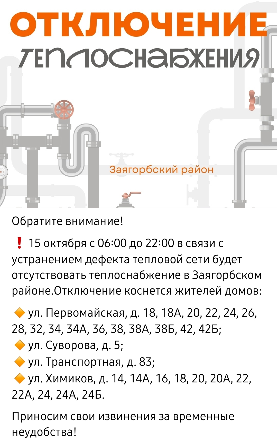 16 октября с 6:00 до 22:00 отключат тепло и горячую воду в Заречье в домах: